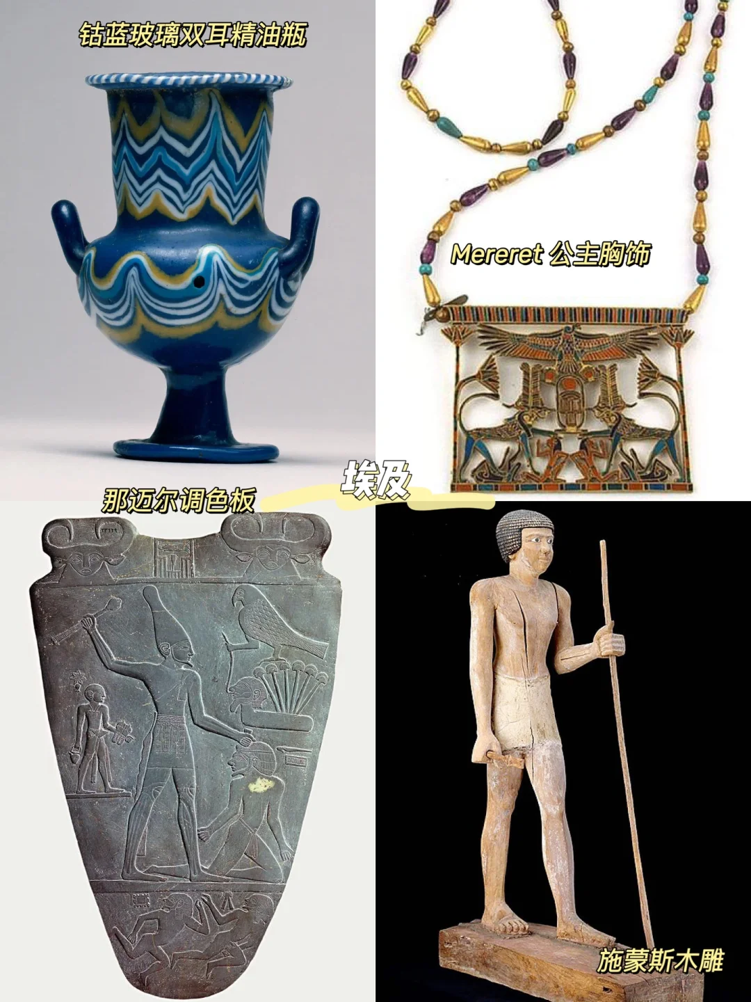 🎊古埃及人工艺超绝。玻璃方面,他们发明了沙型法,用沙子做模,浸入玻璃溶液,冷却后再把模取出来,有些还把玻璃丝融化,嵌入主体做装饰,效果流光溢彩。