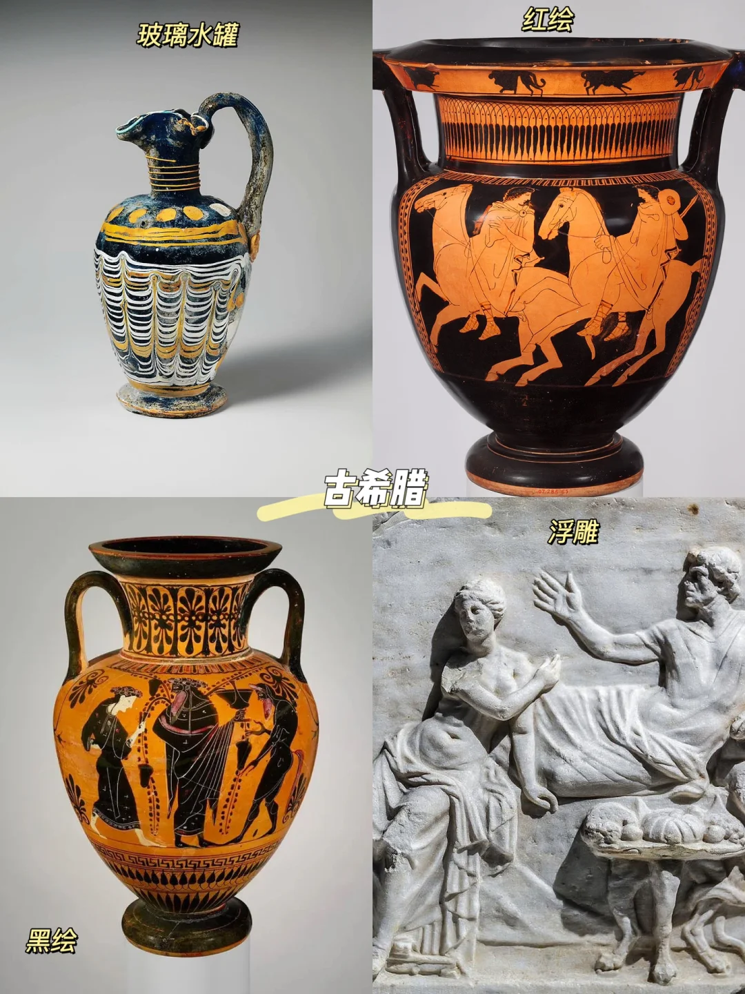 🏺他们的陶瓷最早叫斑纹彩陶,是在陶胚上不规则地涂抹颜料烧制出来的。这之后,陶艺又经历了几何风格,东方化风格、黑绘、红绘、白地彩绘等形式。
