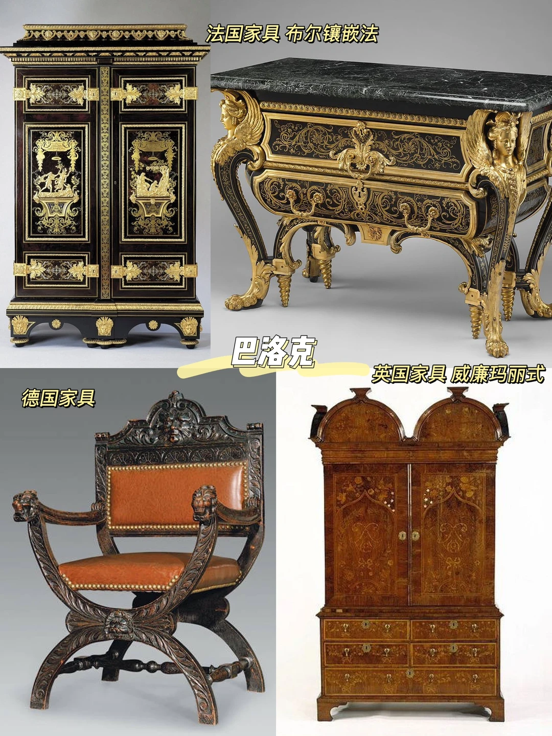 🪑17世纪巴洛克是家具发展的时代,法国完善了布尔镶嵌法,即将金属片和龟甲叠在一起,刻成图案镶嵌于家具表面的技法。