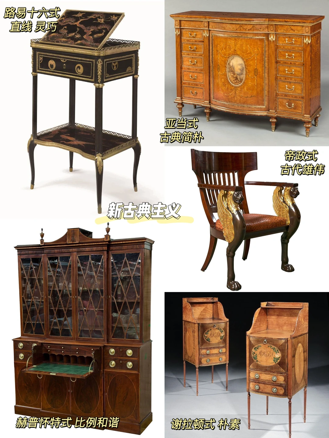 🪵到了19世纪,家具发展出路易十六式和帝政式、亚当式、赫普怀特式、谢拉顿式等风格。