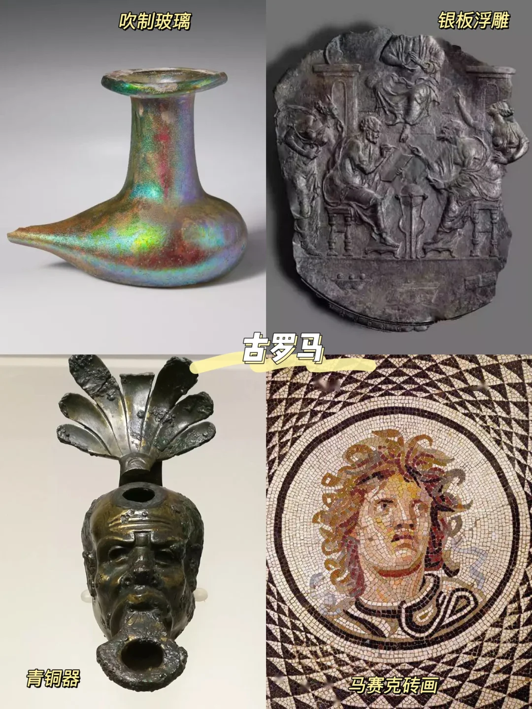 🍸古罗马人开创了玻璃吹制法,并在上面附加浮雕宝石、马赛克、雕花、镂空、玻璃釉、金箔等装饰,畅销世界。