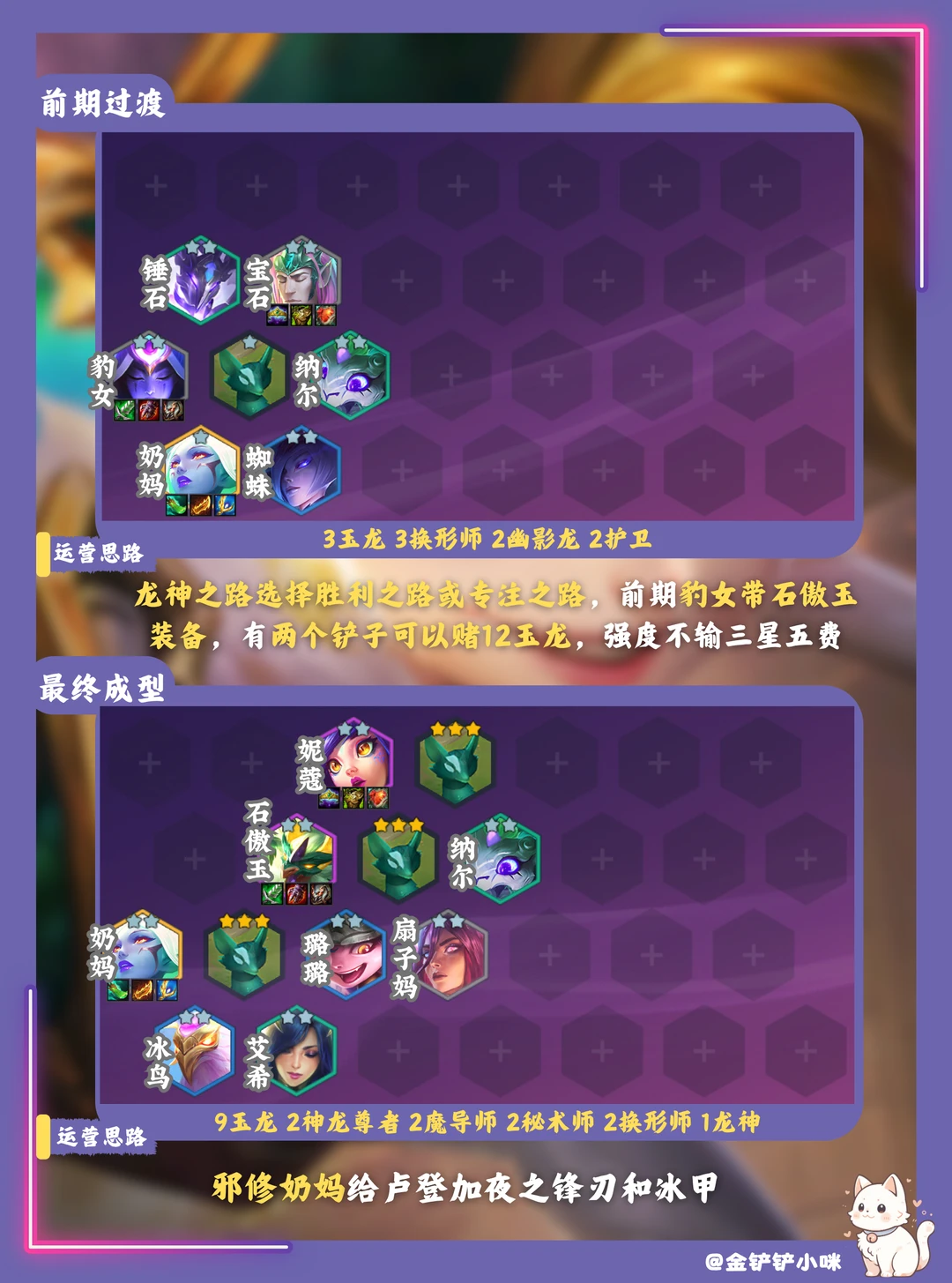 🔴奶妈强度T0.5 拿到可以试试邪修卢登夜刃冰甲奶妈 🔴奶妈福气临门效果:累计为小小英雄回复10血量,获得5金币,被溢出治疗解体的奕子30%概率掉落1个随机散件装备 🔴追大羁绊100层找铲&锅,追三星五费100层找大妮蔻,龙神多125层找专属龙神强化