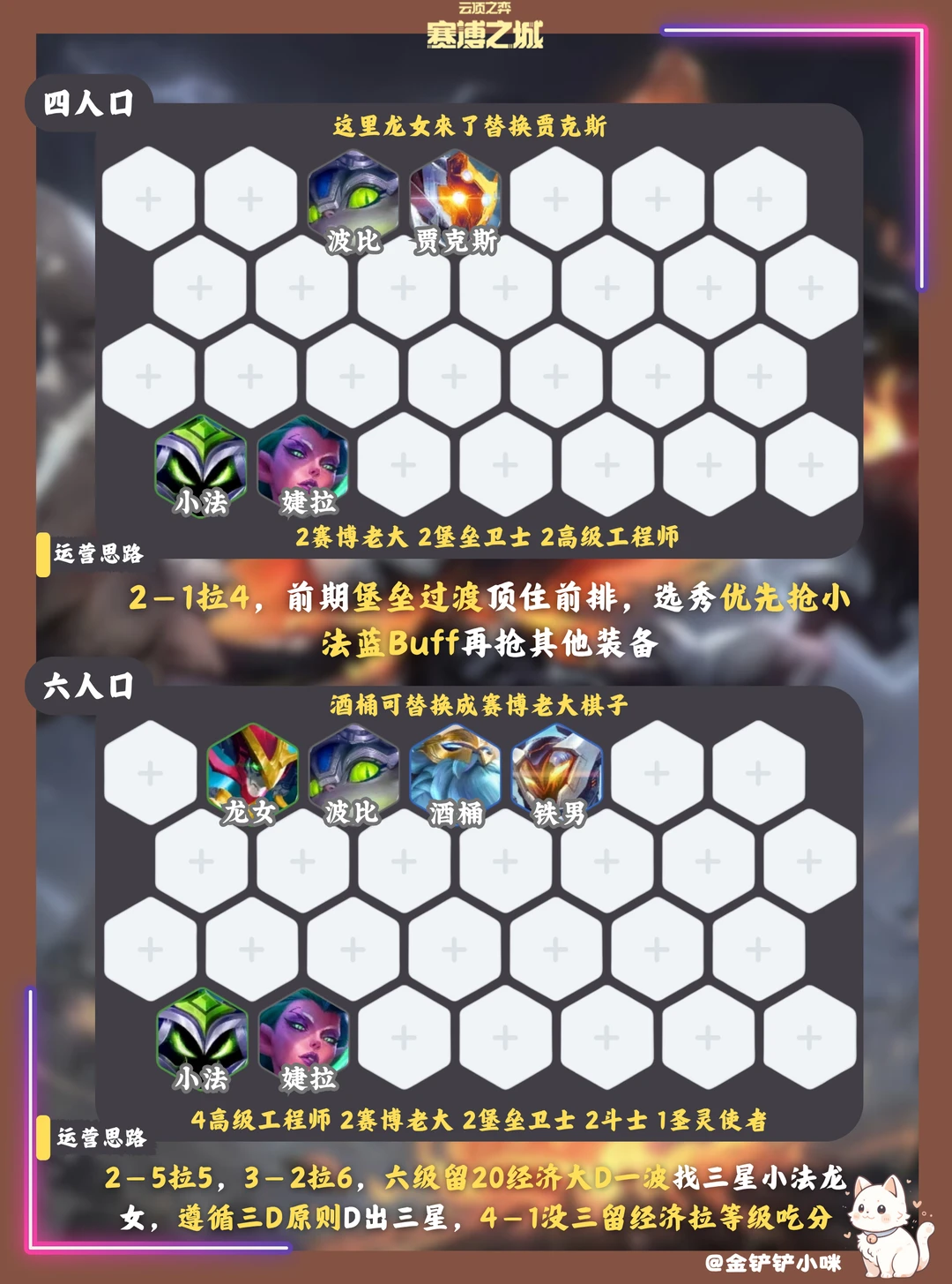 3️⃣阶段3-2拉6,卡20利息大D找三星小法龙女,4-1之前没双三就攒钱卡50后再D三星,三星后马上跳过七级拉八找高级工程师和赛博老大棋子,因为七级是弱势期卡羁绊有点尴尬