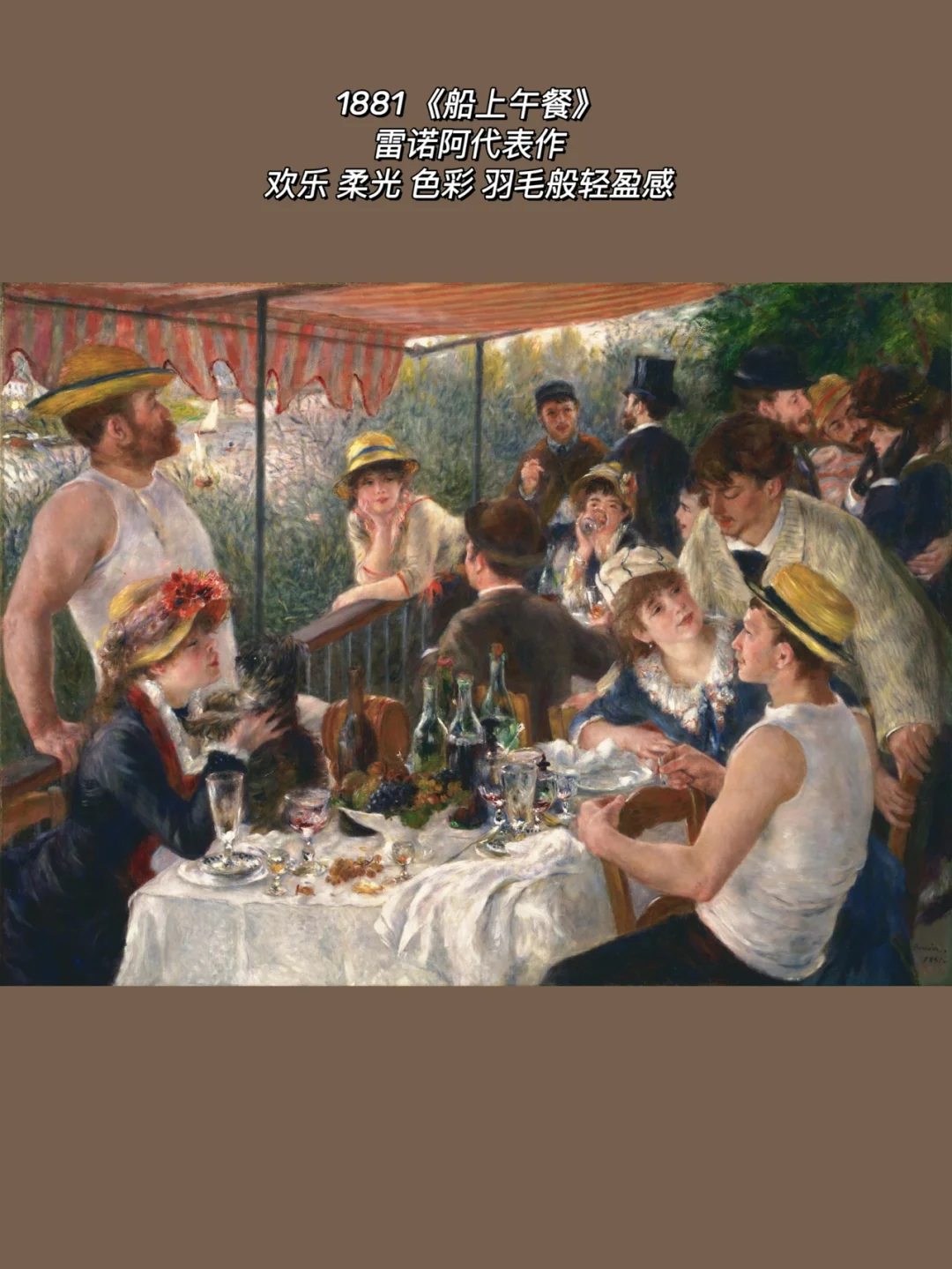 🛥3年后,雷诺阿创作出他的印象派代表作《船上午餐》,欢乐的人群沐浴在柔光和色彩里,愉悦就像轻飘飘的羽毛,扫进每个人心里。