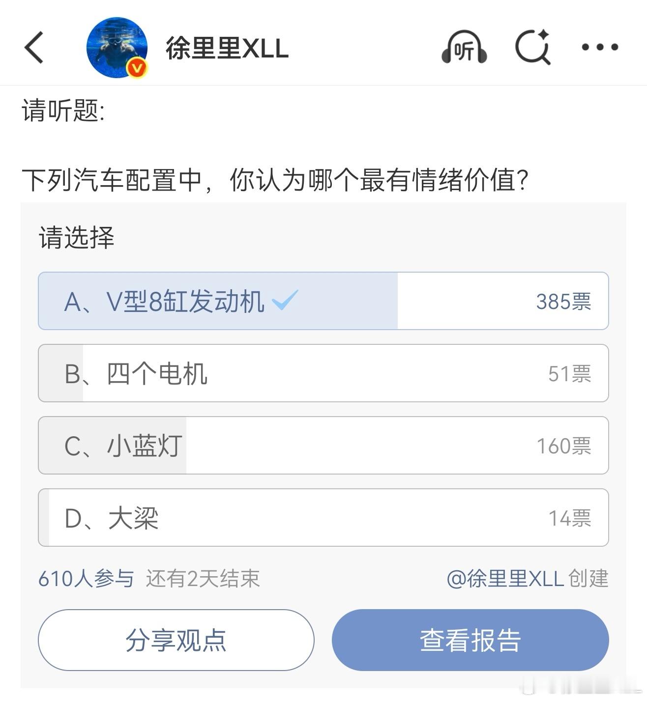 看来大家普遍对四个电机没什么兴趣。那么。世界上会不会有V8发动机+小蓝灯的终极情绪价值产物?长城能不能让人期待一下?如果是那种类似反置Hi4的技术架构,V8引擎中置布局。采用中小电池的策略,满足100公里纯电续航。可以实现纯电前驱+纯电四驱。同时可以实现V8后驱+纯电前驱和V8并联后驱组成的四驱这一系列动力分配效果。你会不会买?长城真把这种前无古人的东西搞出来,反正我真买。我现在比较担心的是什么?那就是中置V8插混的前轴电机应该叫什么?总不能叫P4电机吧...长城净搞这些挑战知识伦理的东西。