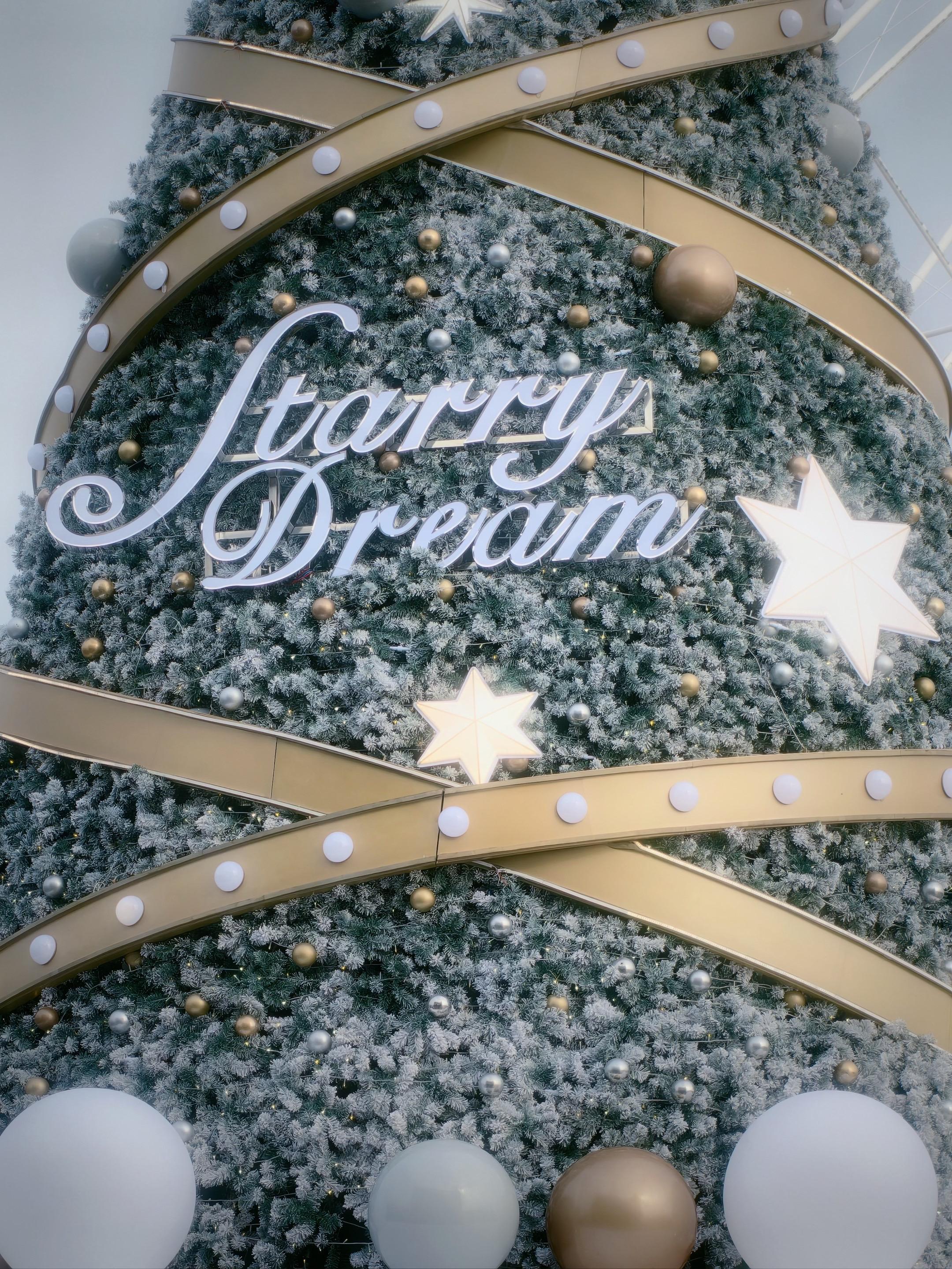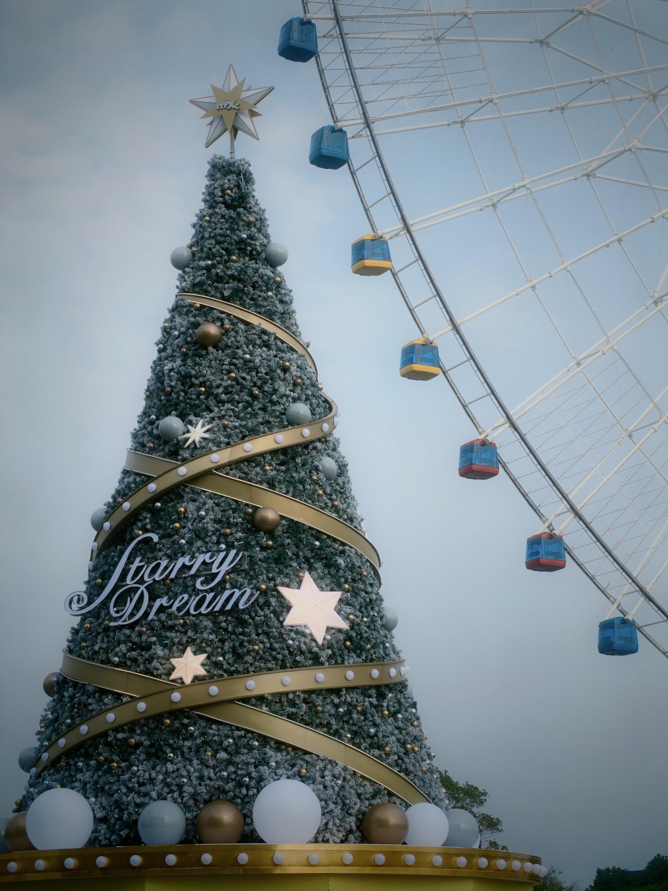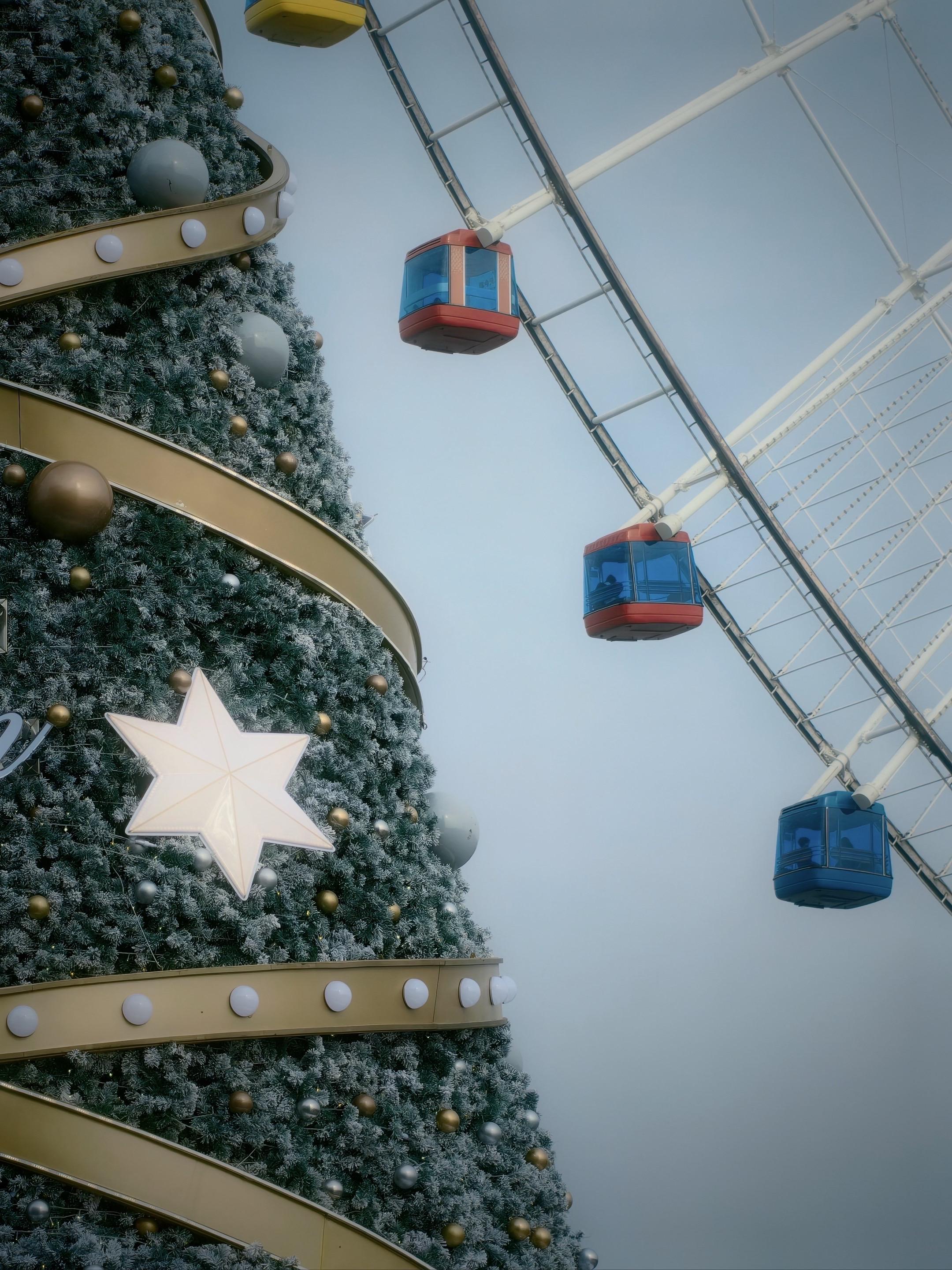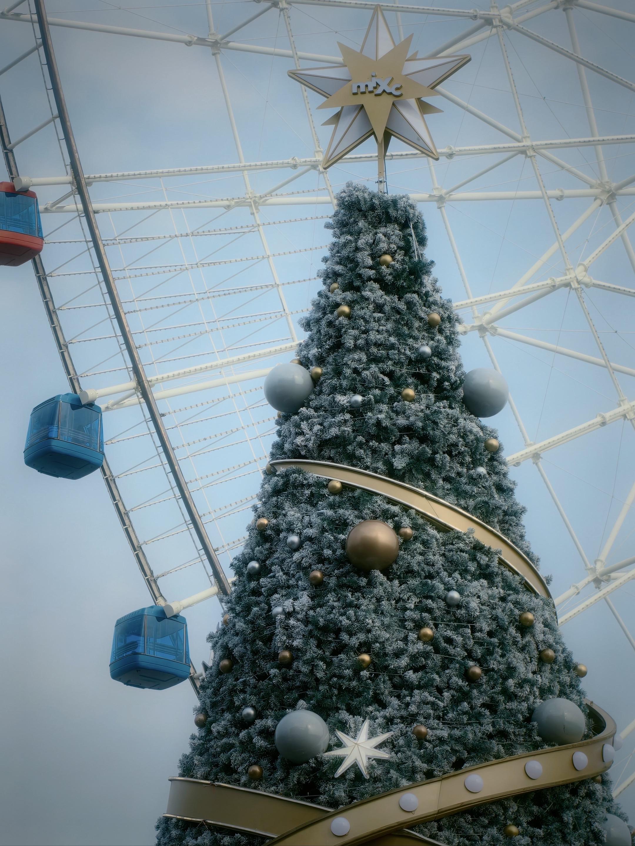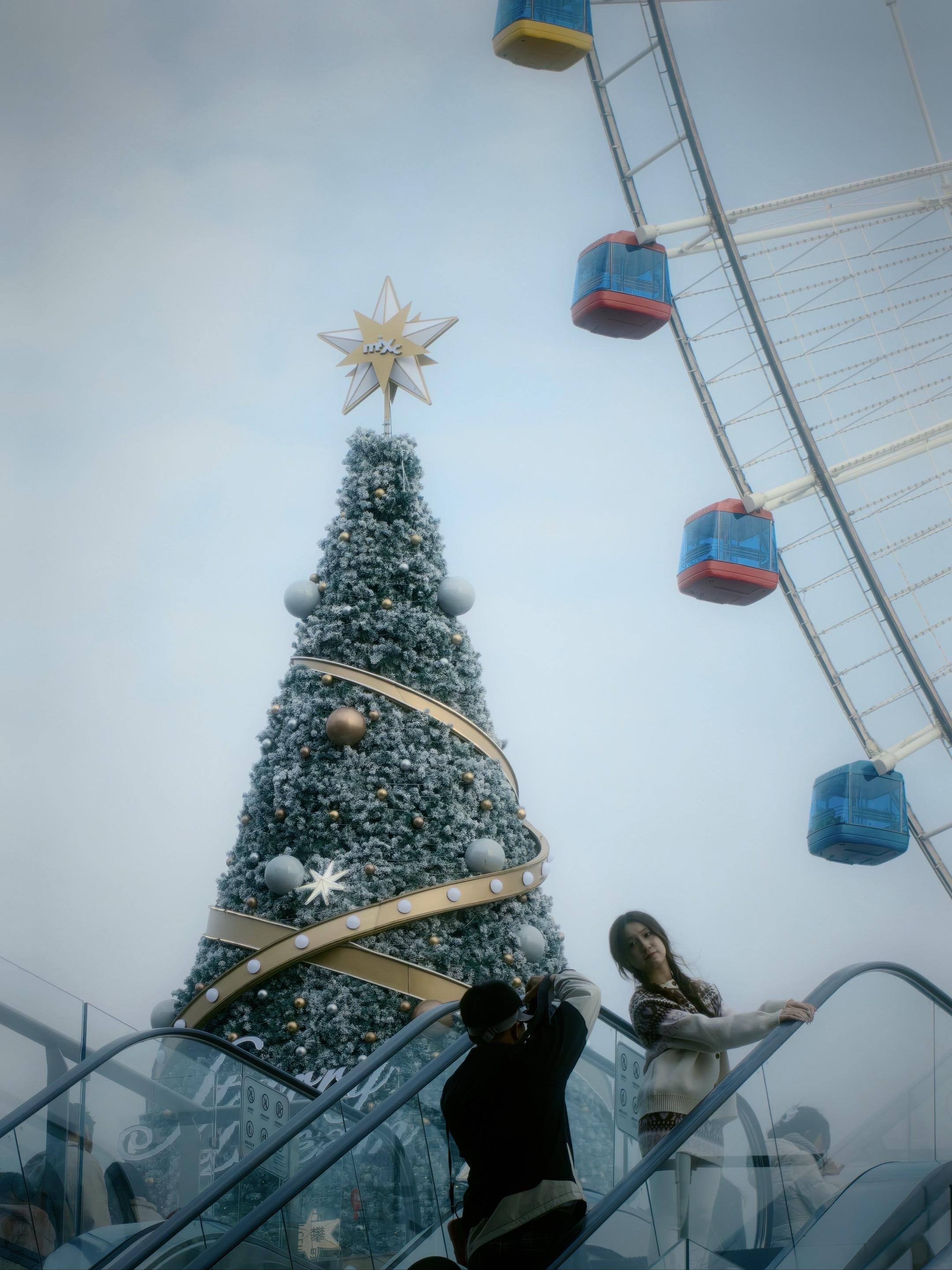 正面全景:站在圣诞树正前方3-5米,用广角镜头拍出树与顶部装饰的震撼感。