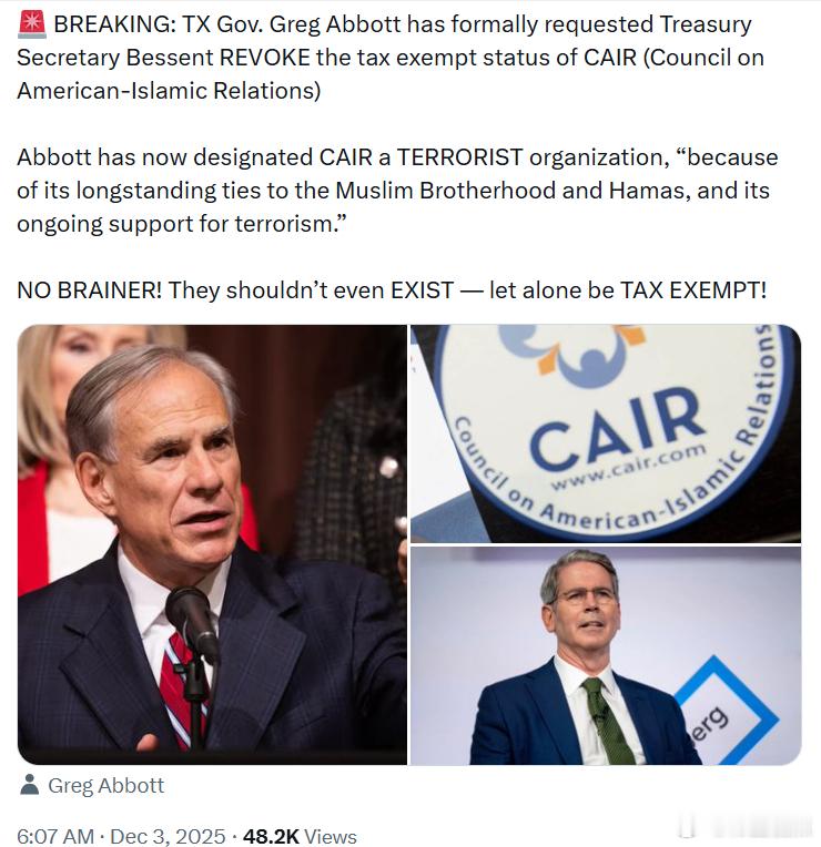 德克萨斯州州长格雷格·阿博特已正式要求财政部长贝森特撤销美国伊斯兰关系委员会(C
