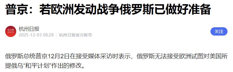 普京:若欧洲发动战争俄罗斯已做好准备! 普京之所以这么说话,是因为从美国抛出的那份“28点和平计划”,一出炉就引发了欧洲的强烈反弹,这让俄罗斯十分的不满。 据美媒披露,这份计划里要求乌克兰放弃顿巴斯地区、把军队规模控制在60万人以内,还得承诺永不加入北约,这些条款被欧洲批评为“过度偏袒俄罗斯”。 让欧洲不安的是,计划背后还藏着美俄商业合作的小算盘,双方已经在探讨石油天然气勘探、北极资源开发等项目,甚至涉及动用俄罗斯在欧洲被冻结的3000亿美元资产。 欧洲自然坐不住了,英、法、德三国很快主导起草了“欧洲版28点计划”,对美方方案逐条改写,强调“国际边界不应被武力改变”,还反对限制乌军规模的条款。而就在美乌欧三方围绕计划修改反复拉扯时,黑海海域的局势又添变数。 11月28日,乌克兰安全局和海军用无人艇攻击了两艘俄罗斯油轮,导致船只严重损坏无法航行,俄罗斯外交部直接定性为“恐怖袭击”。 紧接着12月2日,又有一艘载着葵花籽油的俄罗斯货轮在黑海遇袭,虽然船员无人受伤,但接连发生的袭击事件让局势骤然紧张。 正是在这样的背景下,普京12月2日接受媒体采访时明确表示,无法接受欧洲对和平计划的修改。他认为欧洲这么做就是想阻挠和平进程,还打算把责任推给俄罗斯。 不过普京也留了余地,强调俄罗斯压根不想和欧洲开战,但“现在”已经做好了应对准备。这话里的战略定力和锋芒显而易见,此番表态既是对欧洲的施压,同时也是反制预告。 欧洲一边抱怨美国“绕过欧洲”搞谈判,一边又通过各种方式加码对乌支持,比如荷兰刚宣布提供2.5亿欧元军事援助,欧盟还在推动用冻结的俄罗斯资产给乌克兰提供1400亿欧元“赔偿贷款”。这种既要参与权又要实际利益的做法,难免让俄罗斯心生不满。 更关键的是,俄罗斯对被排除在欧洲安全事务之外早有顾虑。欧盟委员会主席冯德莱恩就曾强调“任何有关欧洲的事情不能没有欧洲参与”,可在美俄主导的和平谈判中,欧洲却始终处于被动跟进的状态。 黑海油轮遇袭事件更是给了普京直接的表态契机,用“做好准备”这样的强硬措辞,既回应了近期的安全威胁,也向欧洲传递出“别想随便甩锅”的明确信号。 现在的局面就像多方博弈的棋局,美方想通过和平协议抢占俄罗斯市场先机,欧洲不甘被边缘化拼命争取话语权,而俄罗斯则在守住自身利益的同时,用战略威慑确保谈判桌上的主动权。普京的话,正是这场复杂博弈中一次清晰的立场宣示。