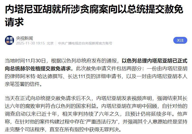 内塔尼亚胡终于知道害怕了! 当地时间11月30日,以色列总统府一纸声明把内塔尼亚胡推到了新的风口浪尖——他正式向总统赫尔佐格提交了贪腐案的赦免请求,连律师都准备好了长达111页的申请材料,字里行间都在强调"这符合国家利益"。 可明眼人都看得出来,这并不是为了国家,分明是自己的司法麻烦实在兜不住了。 这起贪腐案可不是什么小打小闹,早在2020年初检方就以受贿、欺诈和违背公众信任三项罪名起诉了他,成为以色列首位在任受审的总理。 案情也不复杂,2007到2016年间,内塔尼亚胡和家人涉嫌收受以色列商人米勒汉价值28万美元的物品,作为回报就利用职权给对方行方便。按照法律规定,要是这些罪名都成立,最高能判13年监禁,且会丧失竞选总统的资格,这对内塔尼亚胡来说可不是闹着玩的。 过去九年里,内塔尼亚胡拖延审判的花招可不少。一会儿说要处理新冠疫情,一会儿又赶上巴以冲突。就连身体也"很懂事"地出状况——2023年装心脏起搏器,2024年做疝气手术、患流感,今年7月还因为"食物中毒"错过了听证会,气得网民调侃"怎么不把法庭搬病床前"。 法官们一开始还屡屡调整程序,后来也渐渐明白过来这是被当成了"避审工具人",司法程序推进得越来越紧。而现在巴以冲突暂时平静下来,那些用来挡箭的借口突然就不好使了。 更要命的是,今年11月法院已经开始对核心证据进行实质审理,连内塔尼亚胡和企业高层的财务往来都被公开质证,再想找理由推迟可就难了。这时候申请赦免,说白了就是实在没牌可打了。 不过以色列的赦免制度也不是随便就能用的,总统虽然有权赦免,但通常得等法院定罪后,像这种没宣判就申请的情况极其罕见。 有意思的是,美国前总统特朗普还专门写信给赫尔佐格呼吁"全面赦免",这外来的压力能不能起作用还不好说。毕竟以色列国内早就吵翻了天,支持者说审判是政治迫害,反对者则喊着"法治面前人人平等",连他自己所在的利库德集团,中间派选民的信任度都在往下掉。 更麻烦的是内塔尼亚胡的执政联盟也不省心,极右翼伙伴动不动就以退党相威胁,极端正统派和世俗派的兵役之争更是闹到街头示威。 内塔尼亚胡现在是按下葫芦浮起瓢,司法压力和政治危机凑到了一块儿。这次申请赦免与其说是破釜沉舟,不如说是实在没辙的无奈之举。毕竟再拖下去,不光审判结果难料,2026年的大选恐怕也要受影响。 只是以色列的总统会不会卖这个面子,还得看后续以色列内部的各方博弈了。