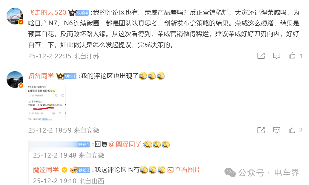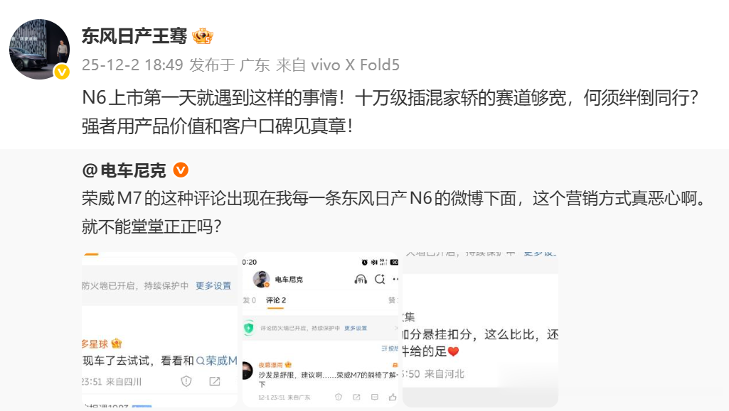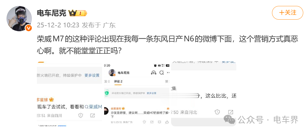 据博主“电车尼克”发文吐槽,“荣威M7的这种评论出现在我每一条东风日产N6的微博下面,这个营销方式真恶心啊。就不能堂堂正正吗?”