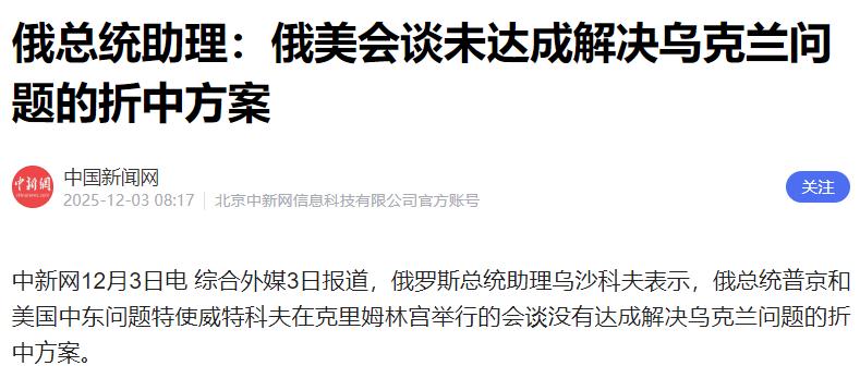 俄乌冲突会谈失败!   不久之前,俄罗斯总统助理乌沙科夫亲自向媒体宣布,刚结束的俄美高层会谈压根没就乌克兰问题谈出任何双方都能接受的折中方案,美方带来的提议直接被俄方拒之门外,这场备受关注的谈判就这么不欢而散了。   要说这事儿的来龙去脉,还得从美方那份修改后的19点"和平计划"说起。这份计划可不是美方单方面拍脑袋想出来的,是11月底美欧乌三方在佛罗里达州磋商后的产物。   最初美方其实拿出的是28点方案,结果因为内容太偏向俄罗斯,不仅欧洲国家反对,乌克兰内部也吵翻了天,后来经过瑞士日内瓦会谈的修改,才缩减成了19点。   可别以为修改后就合理了,这份新计划里把领土划分、乌克兰加入北约这些最核心的问题全都暂时搁到了一边,反而放宽了对乌军规模的限制,连所谓的"战争罪行"特赦条款也给删掉了。美方带着这么个方案去莫斯科,心里打的小算盘其实挺明显。   特朗普政府眼下正盯着明年的中期选举,急着要拿外交成绩来拉票,所以一门心思只想尽快促成停火,至于冲突的根源问题解决没解决,好像没那么上心。   为了推动协议达成,美方之前甚至给乌克兰下了最后通牒,威胁说不接受方案就撤回全部援助。可他们偏偏忘了,俄罗斯这边可不是随便能糊弄的。普京早在11月27日就亮明了态度,强调俄罗斯要么和平收复所有声称拥有的土地,要么就武力夺回,领土问题就是俄方的红线。   说实在的,美方这份计划简直就是揣着明白装糊涂。2021年俄罗斯就曾提出过安全保障协议,明确反对北约东扩,结果被美方直接拒绝了,现在又想把乌克兰加入北约的问题搁置,这不是明摆着回避俄方的核心关切嘛。   更别说计划里还藏着诸如"俄罗斯冻结资产投资乌克兰重建"这类透着单方面施压意味的条款,俄罗斯怎么可能点头?   而且这事儿里还有不少耐人寻味的细节。会谈前乌克兰刚换了谈判代表,原来的办公厅主任因为贪腐丑闻辞职,新上任的国家安全委员会秘书乌梅罗夫仓促上阵,本身就给谈判增加了不确定性。   美方代表团里除了特使威特科夫,还有特朗普的女婿库什纳跟着,这阵仗看着挺唬人,可实际拿出的方案却避重就轻,难怪乌沙科夫会说双方只是讨论了实质性内容,连具体措辞都没碰。   说到底,美国想靠这种回避关键问题的方案让俄罗斯妥协,显然是在做白日梦。俄乌冲突闹了这么久,核心分歧从来都摆在台面上,领土、北约、安全保障,这些问题绕不开也躲不掉。光想着靠一纸不接地气的计划就结束战争,未免也太天真了。   现在各方虽说都表示会继续保持接触,但照这个态势,要想真正谈出结果,恐怕还有得磨呢。
