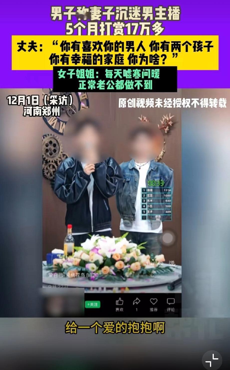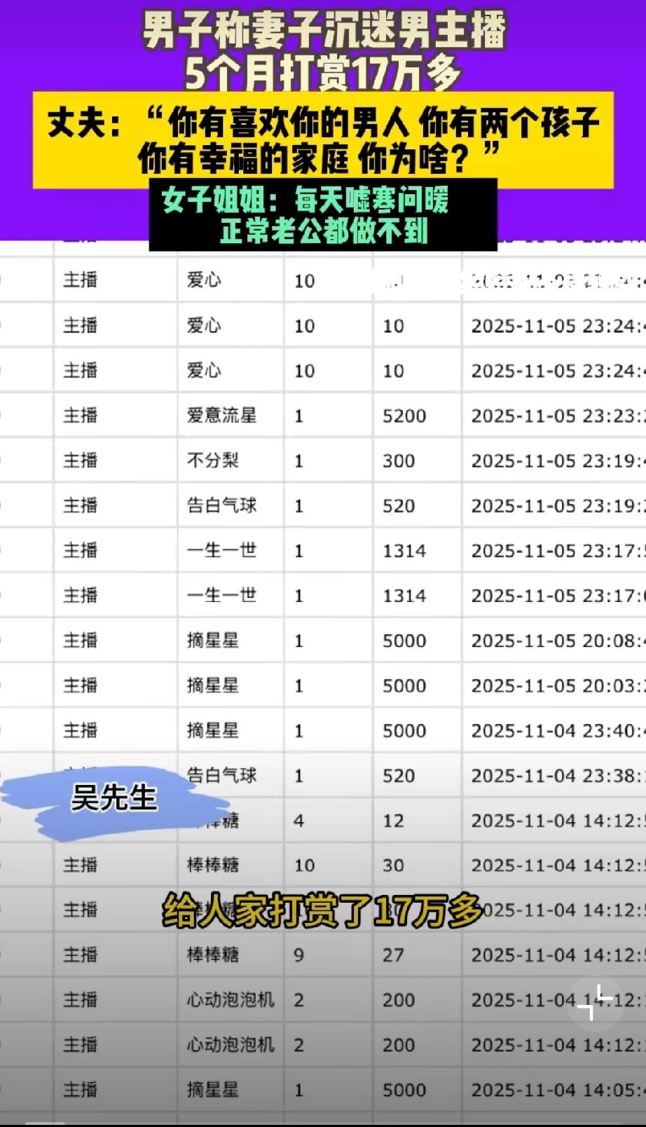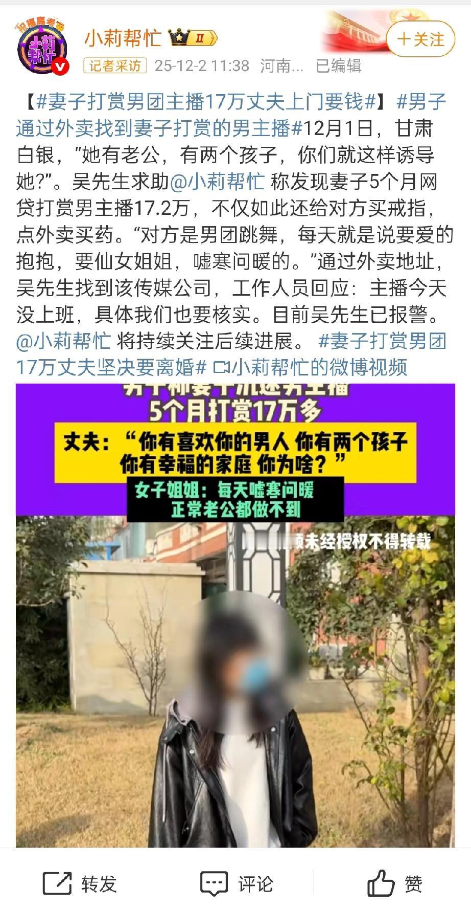 妻子打赏男团主播17万丈夫上门要钱,男子通过外卖找到妻子打赏的男主播。 家庭积蓄本是生活底气,却因非理性打赏陷入风波:女子瞒着丈夫豪掷17万打赏男团主播,丈夫察觉后怒寻主播讨钱,凭借外卖订单锁定地址的细节,尽显维权的急切与无奈。这笔巨款绝非小数目,背后是家庭共同财产的受损,更是夫妻信任的崩塌——追星打赏本是个人喜好,但若逾越经济能力、忽视家庭责任,便成了拖累生活的负担。主播行业的流量变现无可厚非,但面对大额打赏更需尽到提醒义务,而非默许非理性消费的滋生。这场闹剧不仅暴露了部分人追星的盲目狂热,更折射出家庭财务沟通缺失、非理性消费泛滥的现实问题,也给所有追星者敲响警钟:热爱需有度,责任先于喜好,别让一时沉迷毁掉安稳的生活。主播打赏退款 主播打赏收入 法律追回打赏款