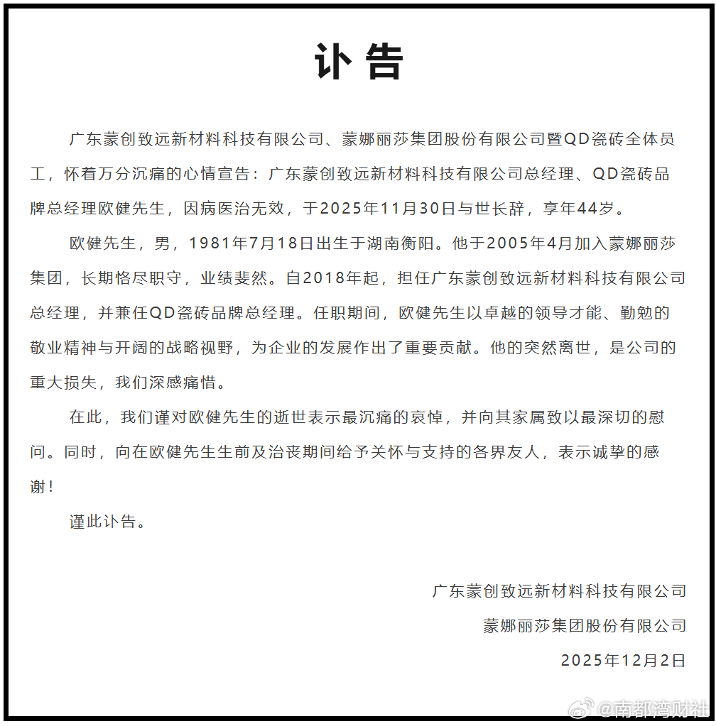 #44岁知名陶瓷品牌掌舵人去世##QD瓷砖总经理欧健因病去世# 【“80后”总经理欧健因病去世,享年44岁】12月2日,广东蒙创致远新材料科技有限公司与蒙娜丽莎集团联合发布讣告:广东蒙创致远新材料科技有限公司总经理、QD瓷砖品牌总经理欧健因病医治无效,于2025年11月30日去世,享年44岁。据讣告介绍,欧健,1981年7月出生于湖南衡阳,于2005年4月加入蒙娜丽莎集团。QD瓷砖是蒙娜丽莎集团旗下三大品牌之一。公司称,任职期间,欧健以卓越的领导才能、勤勉的敬业精神与开阔的战略视野,为企业的发展作出了重要贡献。他的突然离世,是公司的重大损失。今年10月、11月期间,欧健仍活跃在工作一线。蒙娜丽莎子品牌掌舵人欧健因病去世,年仅44岁