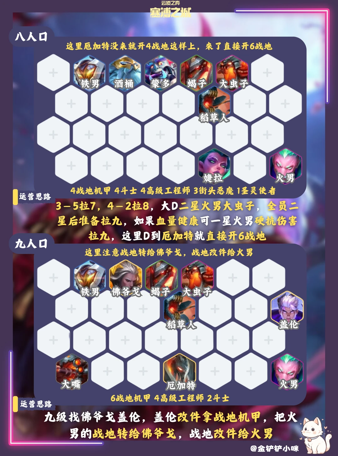 5️⃣阶段九人口找厄加特 佛爷戈 盖伦,盖伦拿战地改件,战地改件给火男,战地转给佛爷戈,阵容大成!
