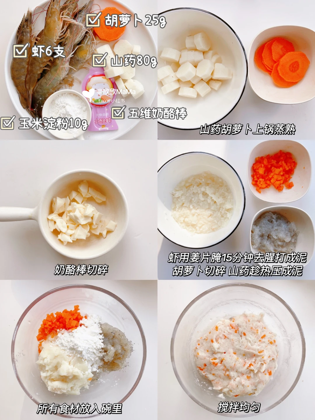 1️⃣山药胡萝卜上锅蒸熟后胡萝卜切碎,山药趁热压成泥,虾用姜片腌制15分钟去腥打成泥。