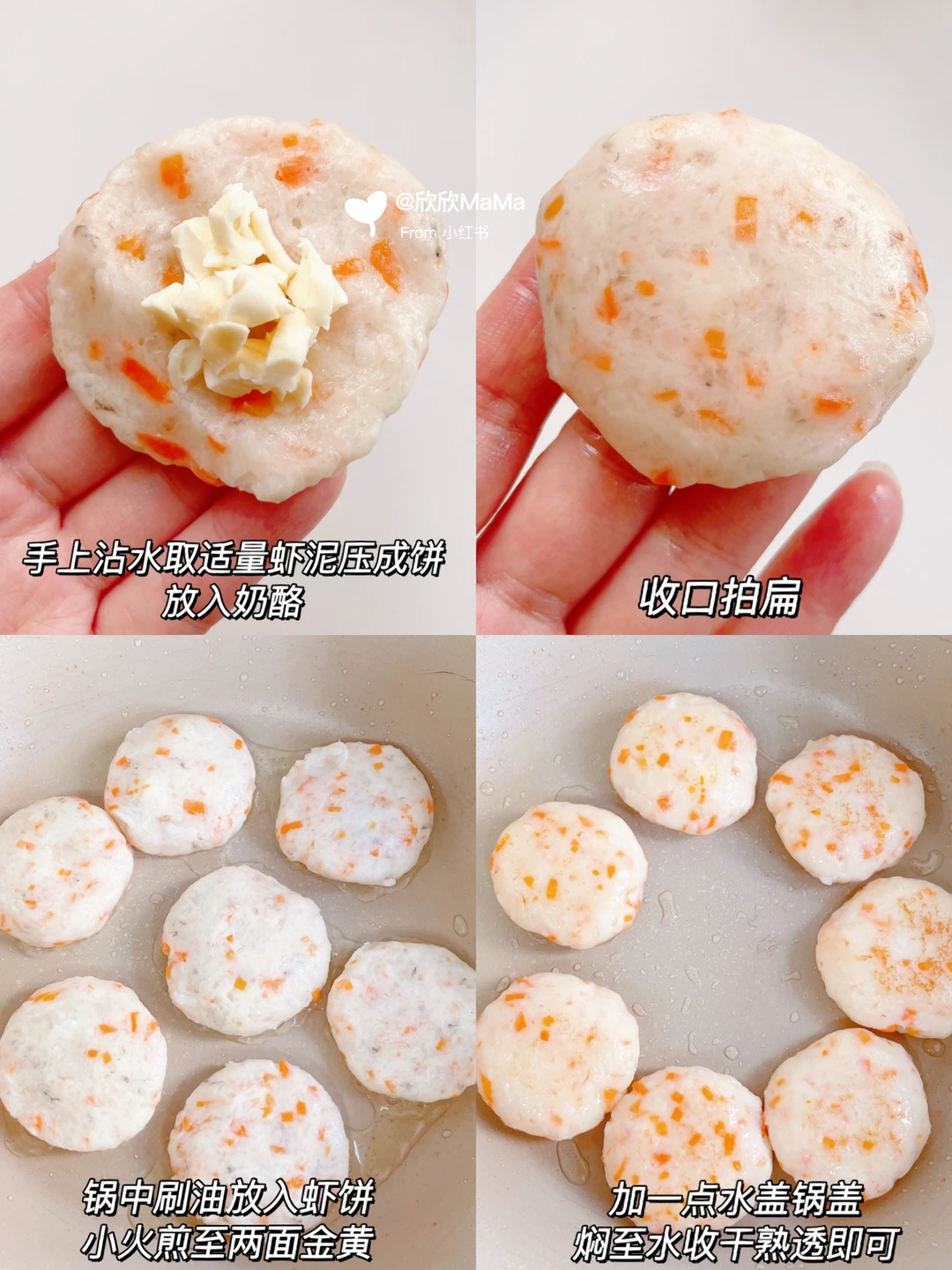 4️⃣锅中刷油放入虾饼小火煎至两面金黄,加一点水盖锅盖焖至水收干熟透即可
