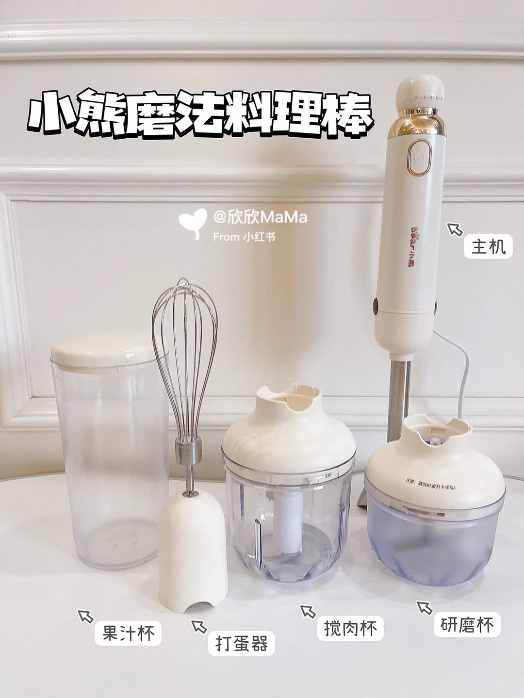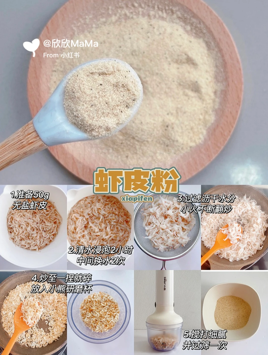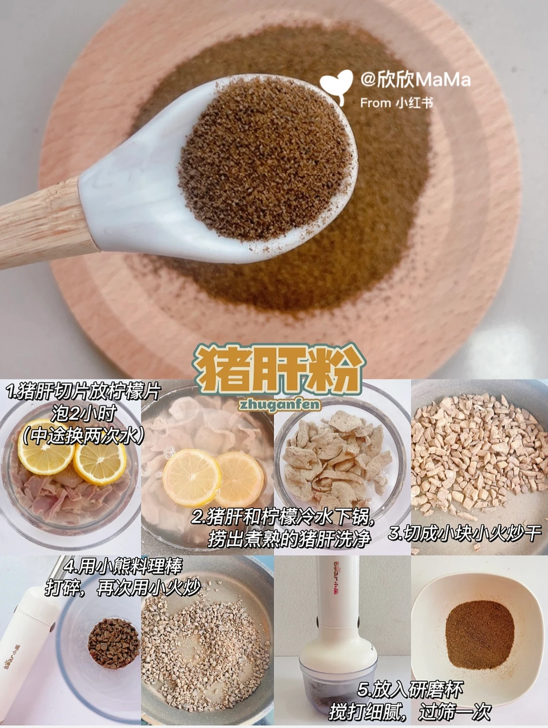 🌟制作辅食粉我用的是小熊磨法料理棒,一个主机可以切换5个不同配件,功能很齐全,有自带的研磨杯、果汁杯、搅肉杯、料理棒还有打蛋器,性价比高,适合各个月龄宝宝辅食制作,做辅食粉用到的是研磨杯,磨粉非常细腻,打几下就够,操作简单,是宝宝辅食好帮手!