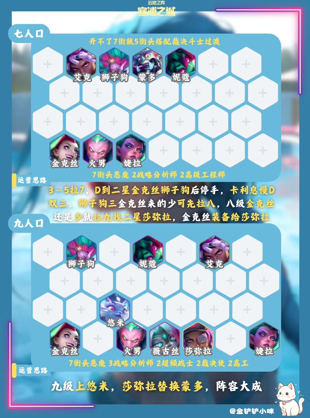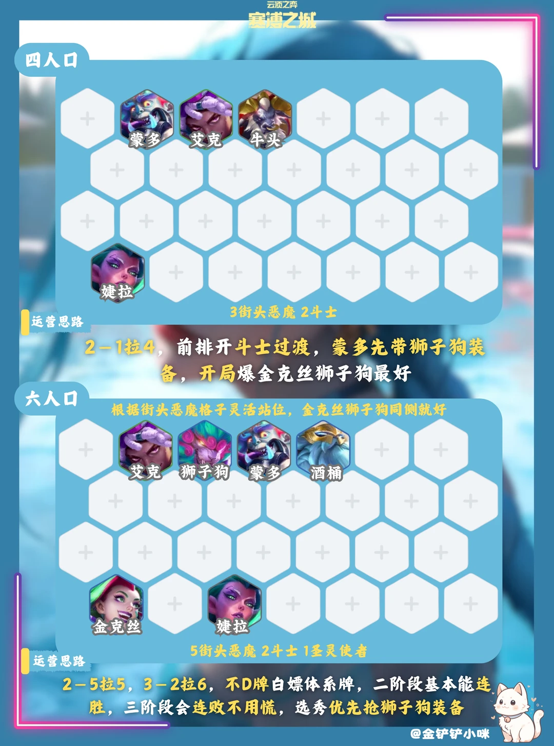 4️⃣阶段七人口开不了七街头就开五街头搭裁决斗士,狮子狗金克丝三星后八人口上薇古丝,不D牌划水过渡