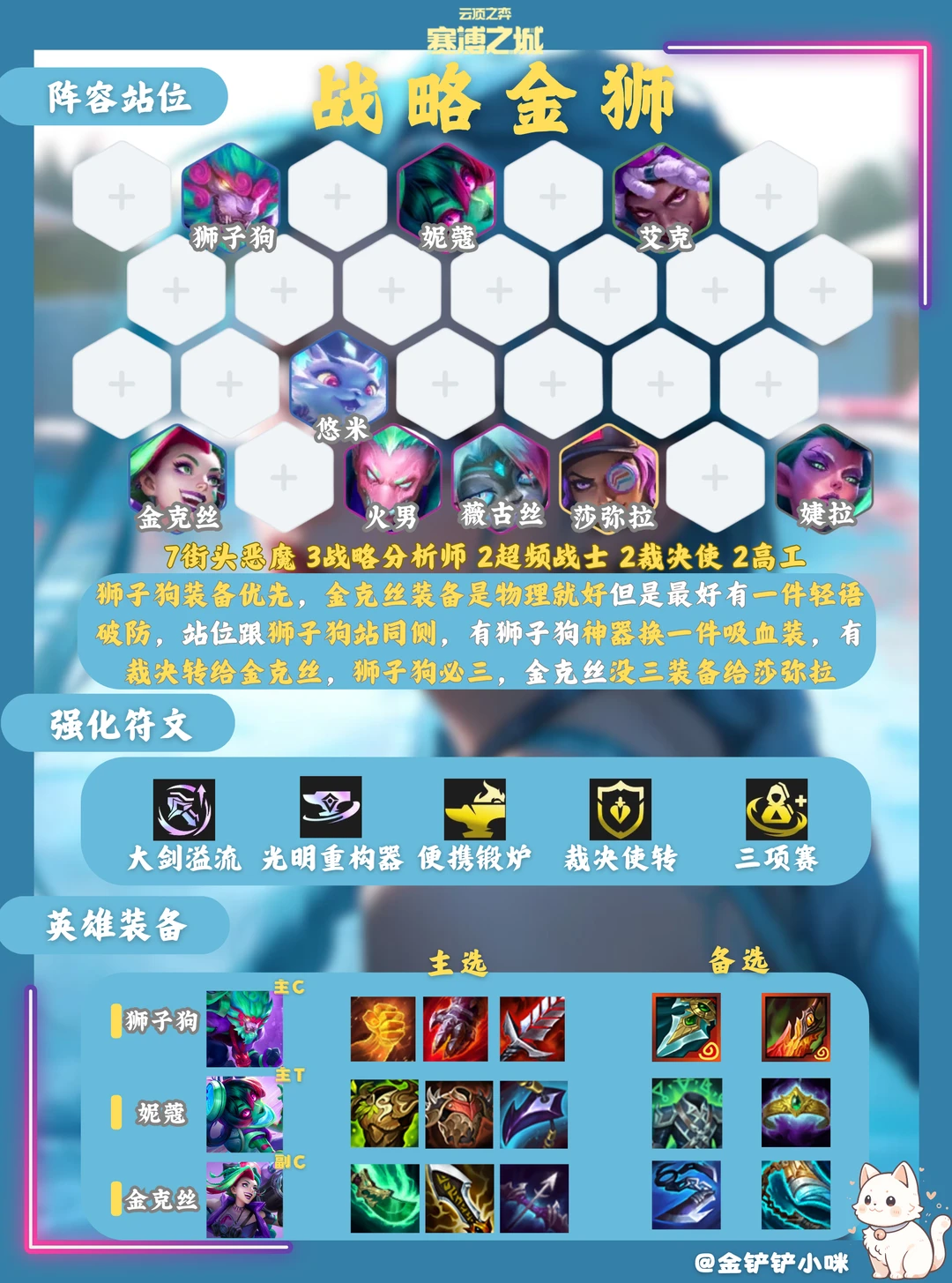 🔴装备优先级:狮子狗装备>金克丝装备=前排装备!选秀优先抢狮子狗装备,金克丝装备不挑有一件轻语帮狮子狗破防就好(狮子狗金克丝站同侧),裁决转给金克丝,狮子狗可带神器有死亡之舞 秘银 弯刀 连指手套都可以(换一件吸血装),金克丝可以带鱼骨头 收集者 魔蕴(这个可以给的比较多只列举几个看情况给就好)