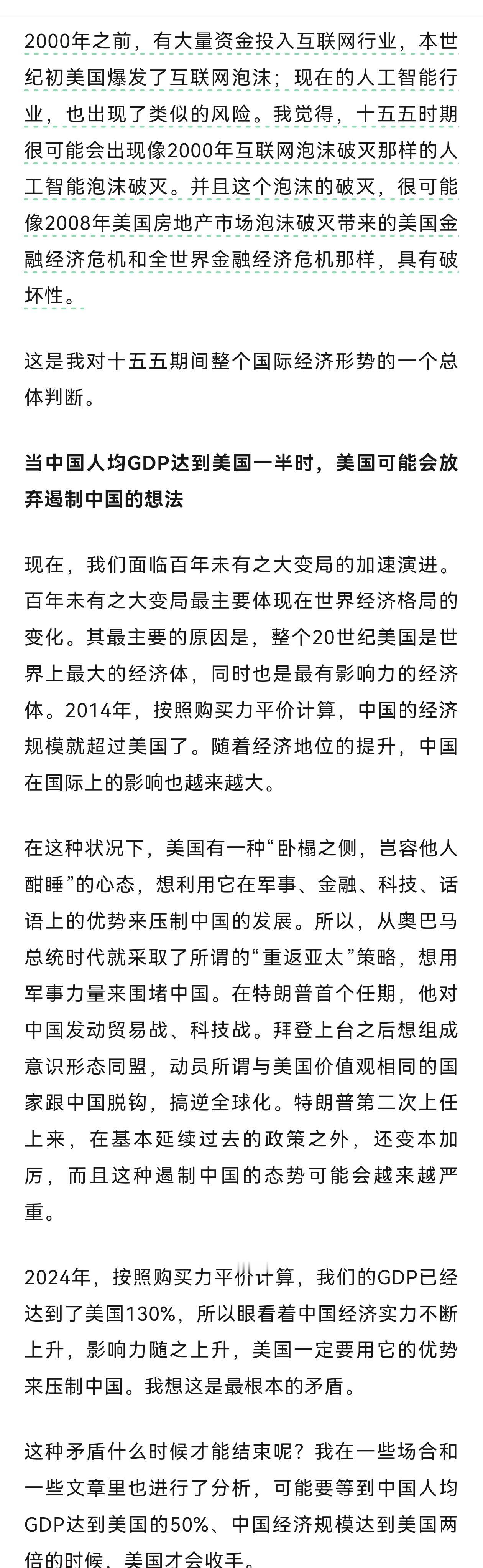 林毅夫最近作了一个预测,未来五年,美国很可能出现人工智能泡沫破裂,带来像2008年金融危机那种破坏。他还说,当中国的人均GDP达到美国的一半的时候,美国可能会放弃遏制中国的想法。 AI泡沫破裂这个预测还真的是有可能的,就像当年的互联网泡沫破裂一样,现在确实已经看到了这种泡沫的风险,毕竟英伟达都撒钱投资让别人买他的芯片,这样的循环是很不健康的。 但是,对于美国放弃遏制中国想法的预测可能就比较天真了。我觉得不管任何时候,美国都不会放弃这个想法的。 所以我们要丢掉幻想,继续战斗。