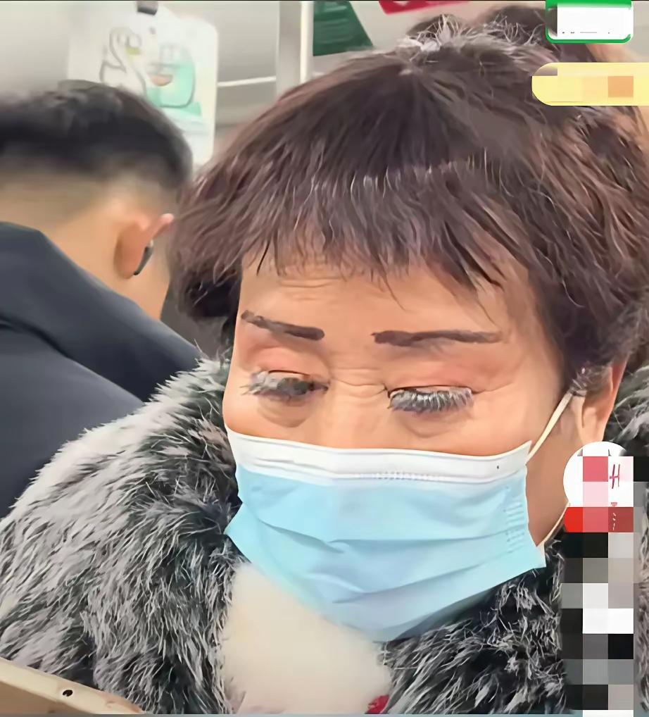 哈哈!大妈,你眉毛画的好有“个性”呀,不过你的假睫毛快掉了! 地铁上偶遇这位老年