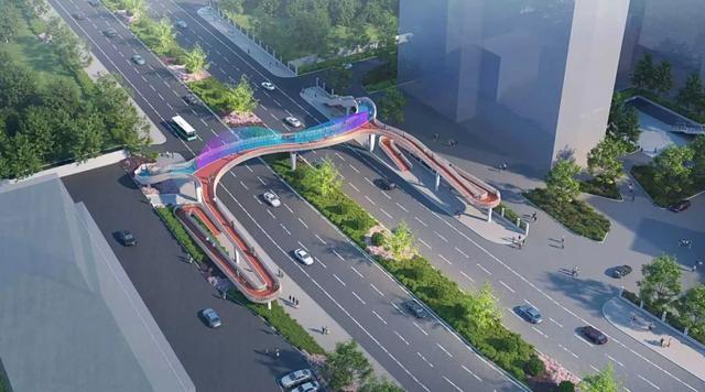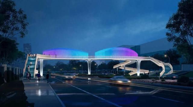 据了解,该人行天桥平面布置主要结合现场环境条件,因地制宜,主桥呈S型,理工校医院侧梯道呈C型,坡道采用设置转向平台的方式,在满足天桥通行需求前提下,减少对既有人行道的占用;人行栏杆以“外挂”的方式附着于桥梁两侧,立面采用独特造型,桥面中心设置变高圆管格栅加以点缀;踏步照明区域以功能照明为主,桥面通过单色静态光,自下而上投光形式,整体以自然内透为主,避免过度照明;桥墩设计参照毛笔笔架,表面真石漆涂装,外侧铝板包裹,独特的外观设计立意新颖,该桥建成后又将成为黄石一处网红打卡点。