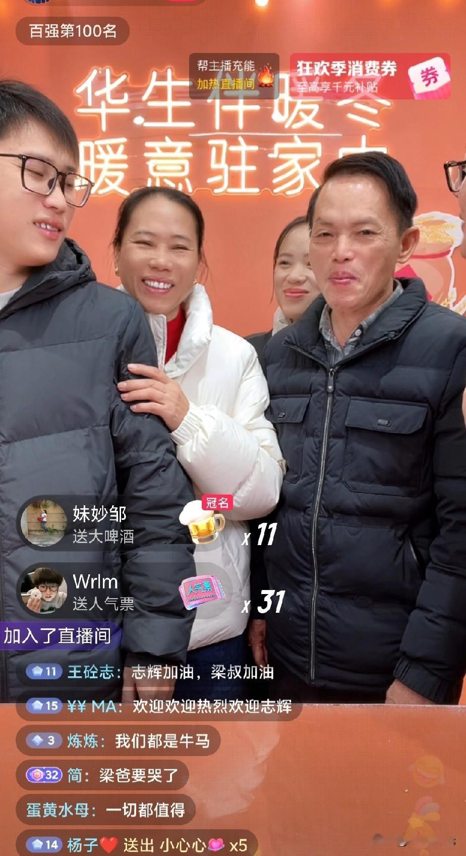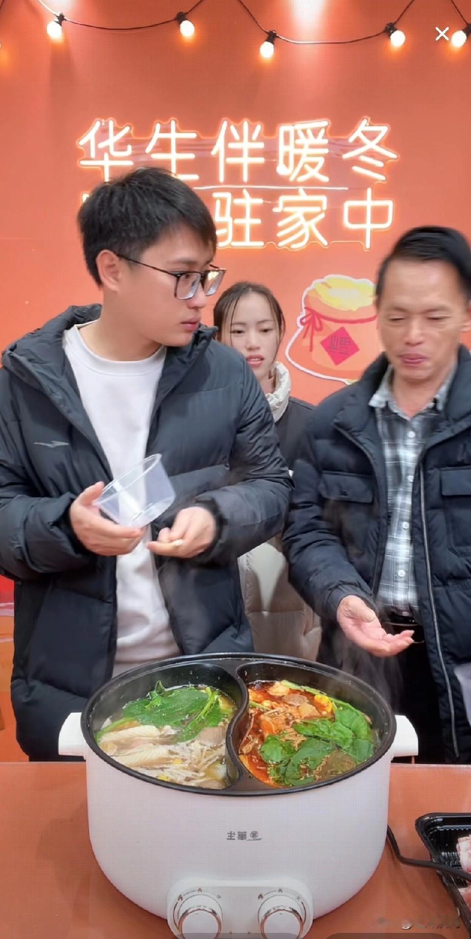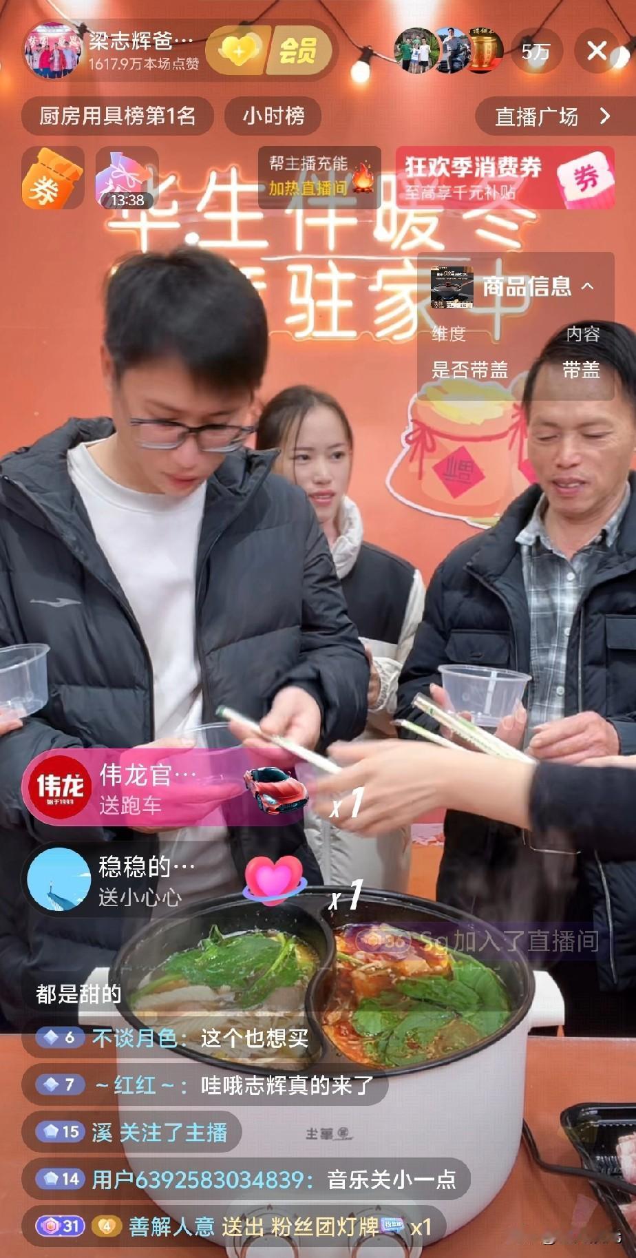 梁志辉今天和爸妈一起吃火锅 他先给谁夹菜呢? 梁爸这场带货太温暖, 梁志辉先把辣的肉加给了妈妈,然后夹给了爸爸。 就冲着他今天站台,助立爸爸直播,梁爸这几十年寻子的艰辛,在这一刻得到了回馈。 梁妈更是每时每刻都想握住儿子的手。 虽然今天卖的是火锅的锅,但助播这一安排很贴心呢,家人一起吃第一顿火锅,冬天确实很温暖。 梁志辉学着助播说,冬天吃火锅,红红火火! 这个锅99元,是一个鸳鸯火锅,梁志辉吃的是不辣的,因为从小在广东,梁爸梁妈和小妹则是吃辣的。