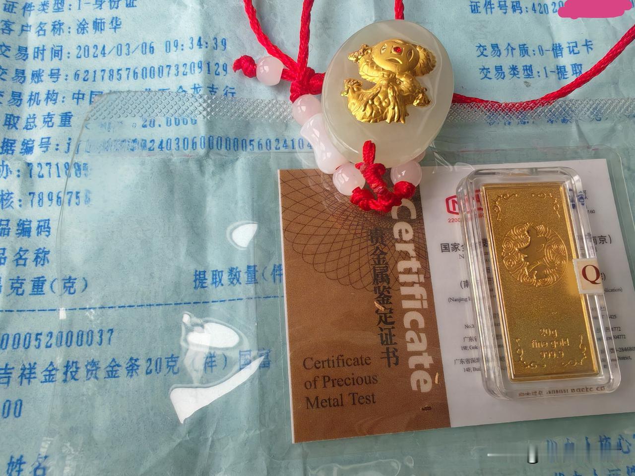 没想到孩子爷爷送了根金条。去年3月份偷偷买的,谁也没说。这次国庆我们回湖北老家,爷爷拿出来送给孩子。 从去年察觉黄金飞涨就想买点,犹豫中越涨越高,也就越发不敢买了。没想到老爷子还挺有心的,知道囤点黄金,买的时候500元/克,查了一下金价,现在差不多翻了一倍。这个投资黄金买的早真的赚大了。