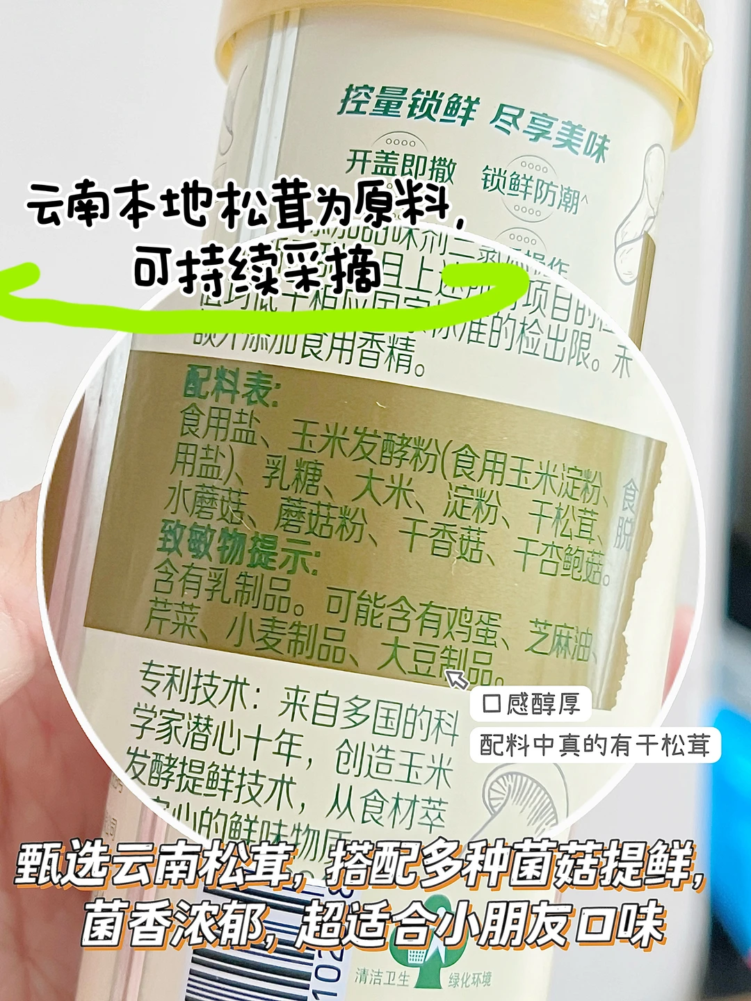 太太乐松茸鲜的配料表里面是真的有添加干松茸,而且是甄选的云南松茸,真真正正做到0添加的,所有成分来自熟悉食材!并且还一直秉承可持续采摘的理念,作为30多年的老品牌始终践行可持续发展宣言,而且还是再搭配多种菌菇提鲜,一开盖就闻到了浓浓的菌香~