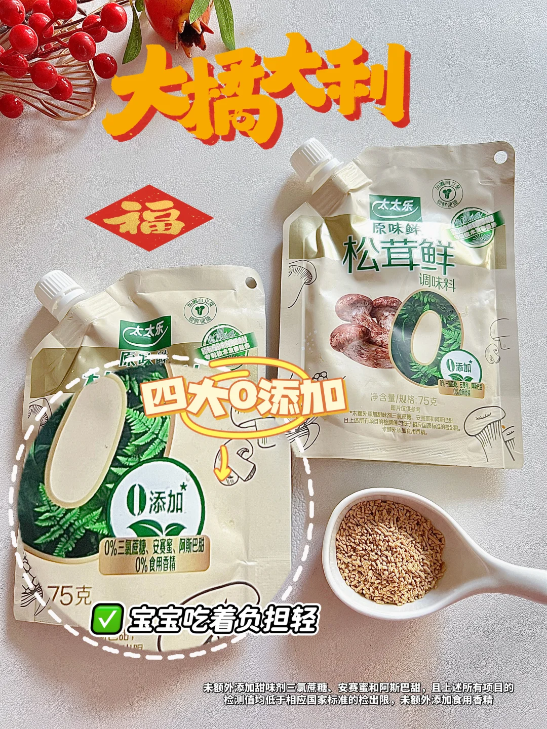配料什么的我也都看过了,非常简洁,而且是四大0添加,宝宝吃着没什么负担~品质方面更不用说,是太太乐自有工厂生产的,知名大品牌品控很严格,用着包安心的~