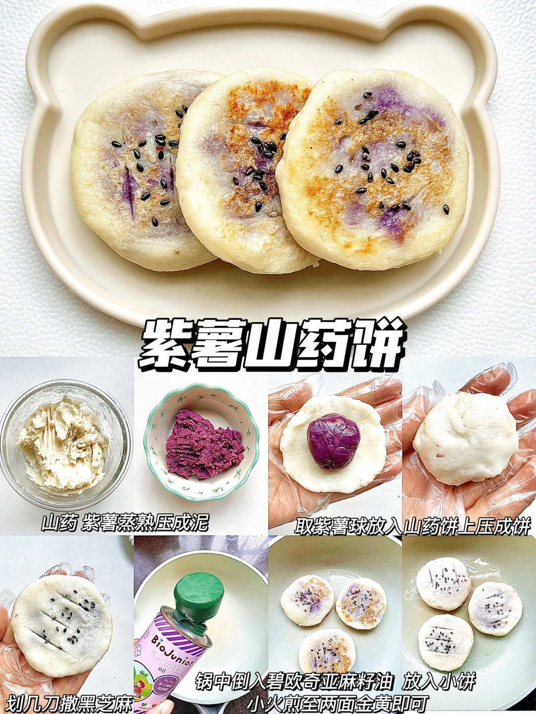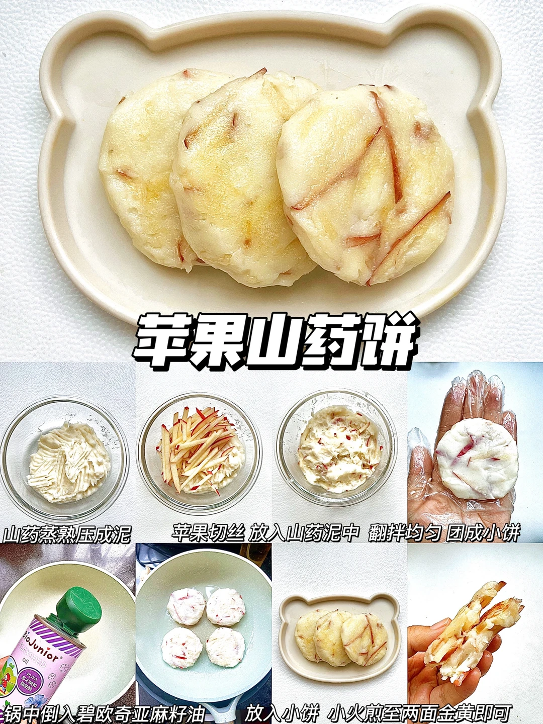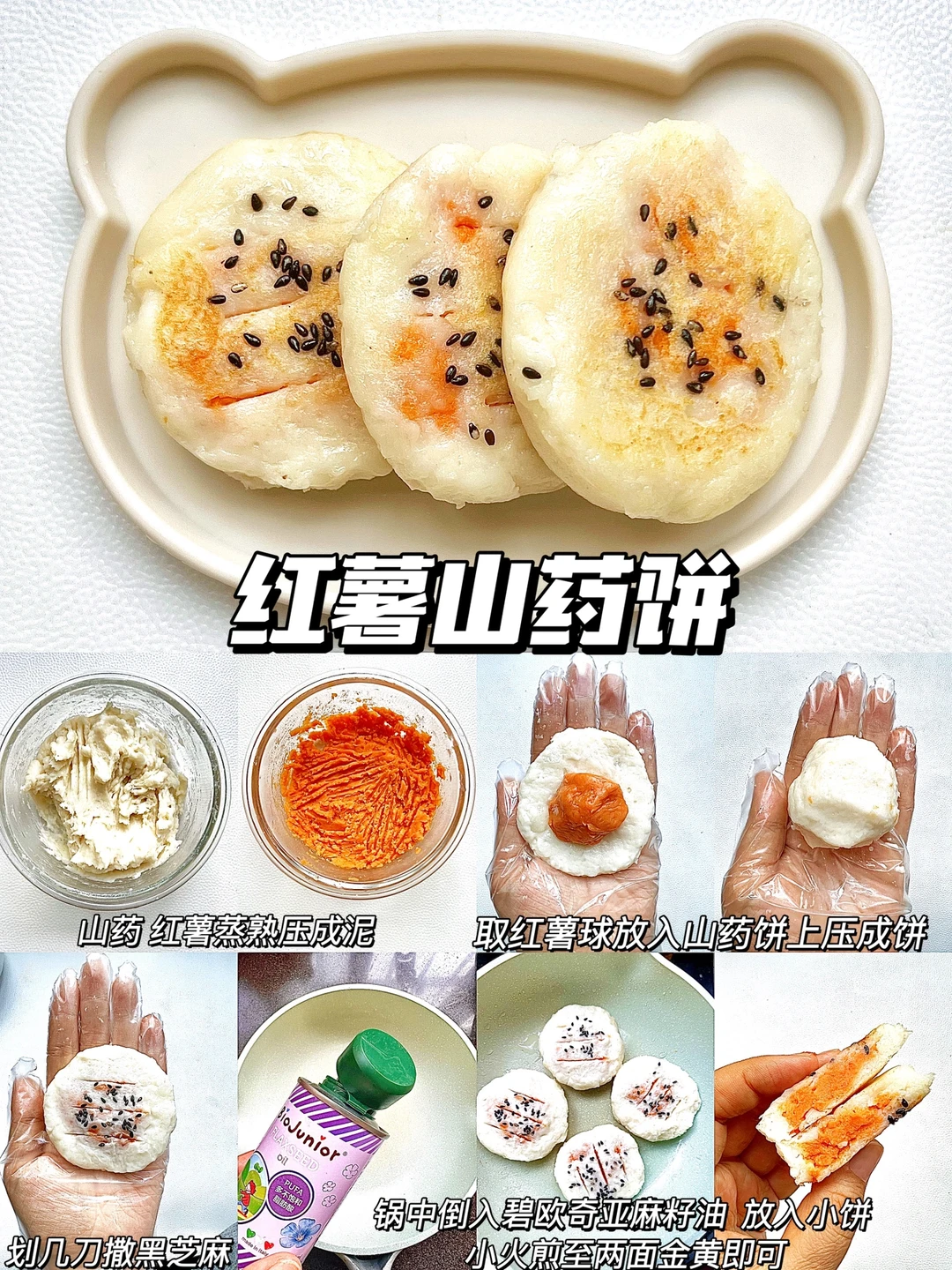 宝宝7个月以后,就可以添加软糯香甜的山药饼了,真的是营养美味,香甜好吃,靠赶紧一起学起来吧~ 🔸紫薯山药饼 🔸时蔬山药饼 🔸红薯山药饼 🔸苹果山药饼 🔸雪梨山药饼 🔸蔓越莓山药饼 ✅这次做山药饼,我用的是碧欧奇亚麻籽油,这款油是宝宝专用热炒油,烟点高达231°,多不饱和脂肪酸含量高,亚麻酸含量 55%,是牛油果的90倍,亚麻酸可以在人体内转化为 DHA,而且油脂纯净,没有苦味,宝宝非常容易接受,宝妈们可以放心选择哦~ 🥣具体做法参考图文教程,食材大小可以根据宝宝咀嚼能力,适度调整~