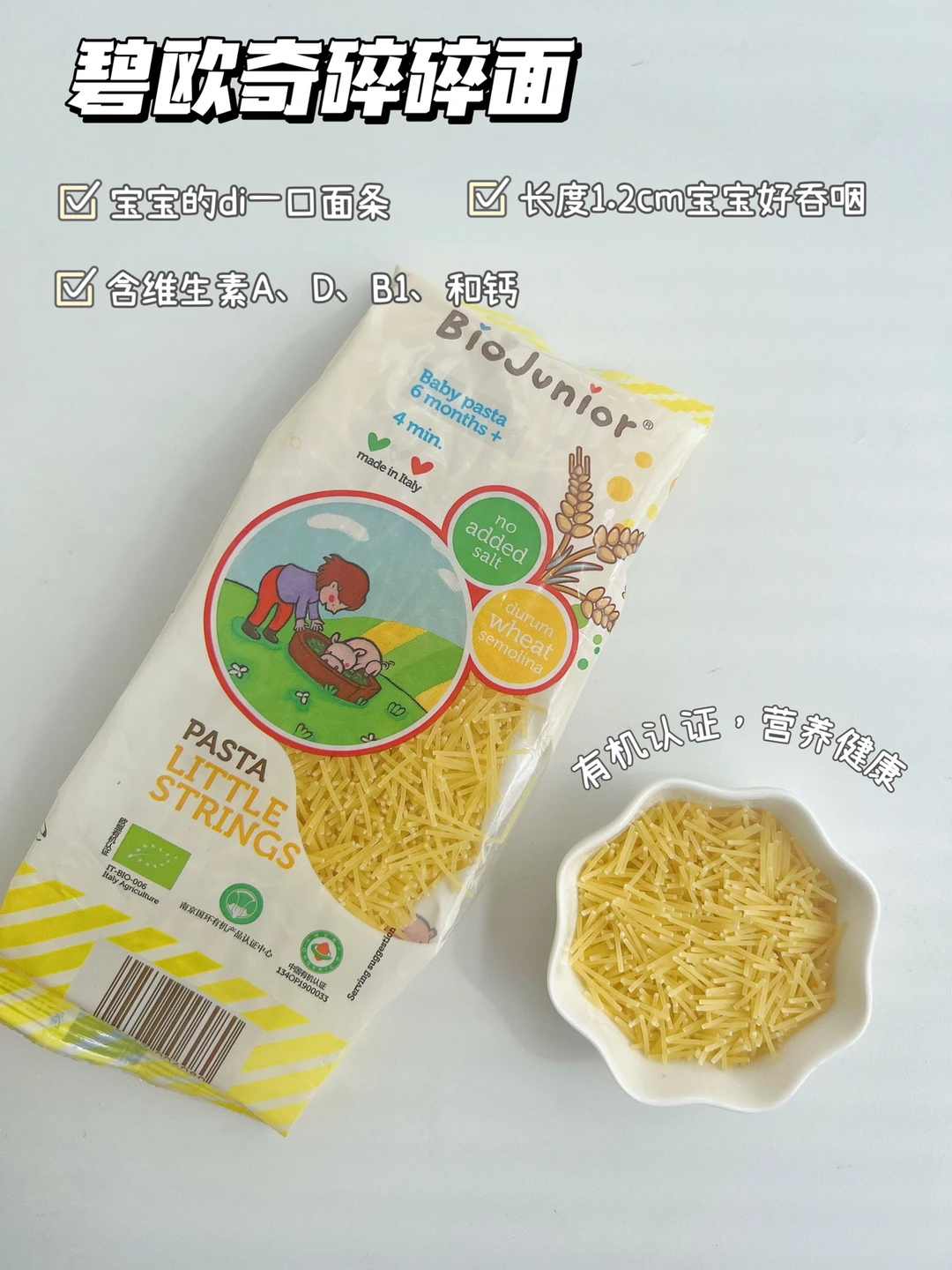 🔸我给我家宝宝初添加辅食时,选的是碧欧奇碎碎面,双有机认证,不添加盐,不会给宝宝肾脏带来负担,平均长度1.2cm,面条细软好吞咽,易煮不起坨,配方只含维生素A、D、B1、及钙铁锌,让宝宝更好的吸收,营养满满,而且还是有机的,它比吃米粉,喝粥更能锻炼宝宝的咀嚼和吞咽,我家宝宝是比较喜欢吃的,初添加的时候,每次都可以吃小半碗,它比较软糯,也容易消化,宝妈们可以放心选择~
