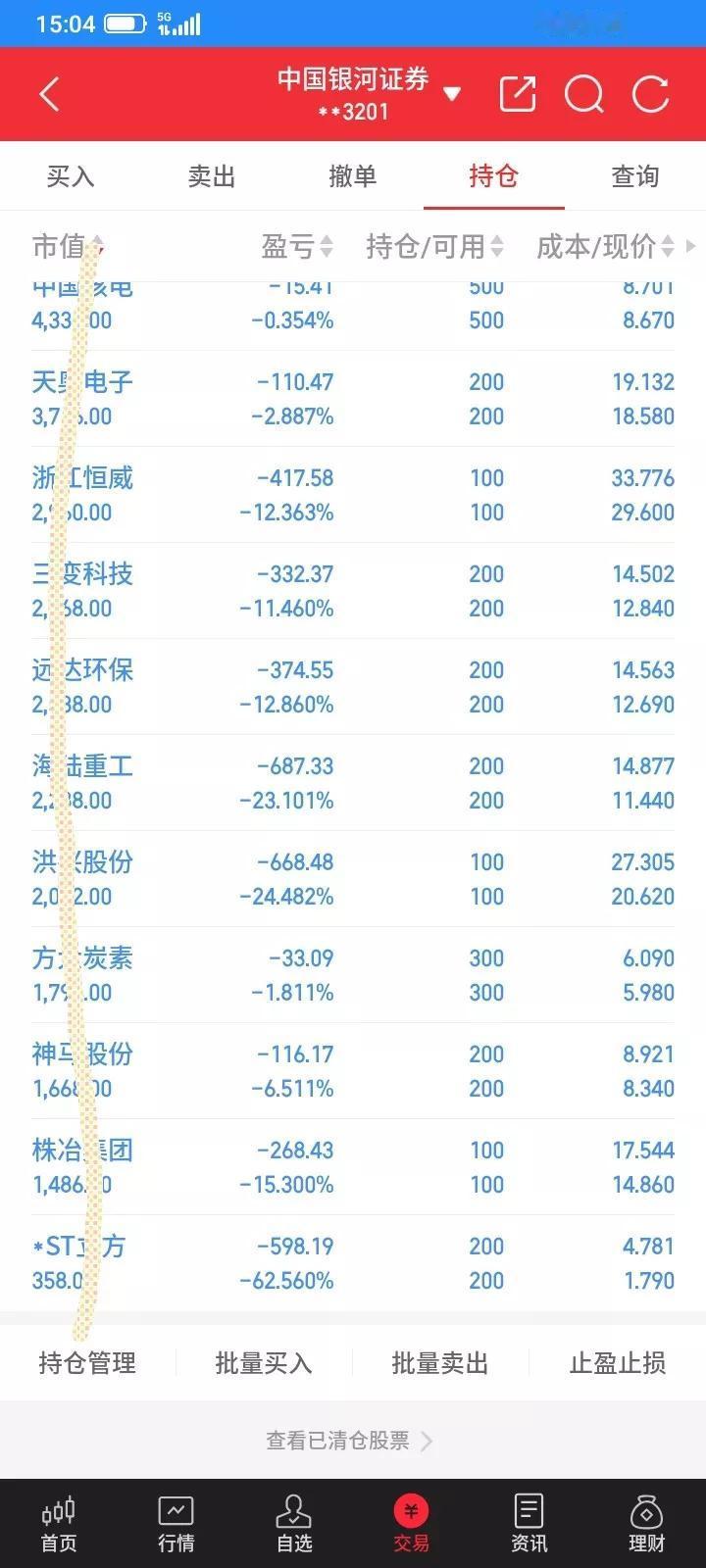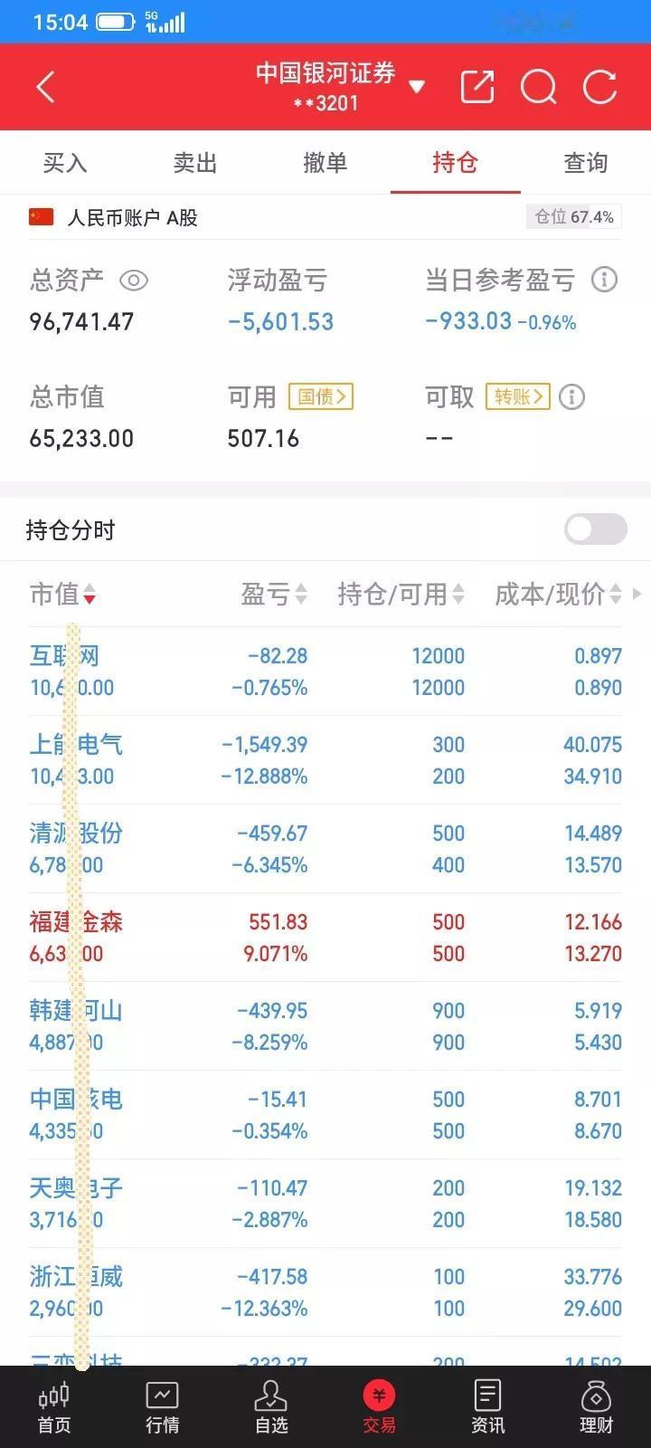 2025.12.04,今天上证指数又是没有跌,但是我持有15只股票,只有1只勉强收红,其它全部继续大跌,而且还都收在当天最低价附近,又是大亏,只有一只etf勉强翻红,但是是计划做网格交易的,涨跌也没有什么意义。前段时间止损后经常上涨,让我感到止损有些多余,全部放弃了止损,但是这段时间却一直下跌,没有止损,越跌越多,越亏越多,每天都舍不得割肉,怕割在黎明前,每天都幻想是最后一跌,但是上涨的时候没有赶上,下跌起来却是没完没了,还好昨天止损了一些,不然今天还要亏得更多,下跌中,不管什么时候止损都是对的,上涨中,什么时候加仓都是对的。 昨天收盘计划买入上能,没有成交,今天早上35.51开盘就往上冲,感觉又错过了,急忙以35.45买入100股,快速上冲到36.75,然后又快速回落,一下子买入成交了,不买不跌,不卖不涨,又一次应验了,买入之后就不断下跌,下午最低跌到34.66,又多亏了80多块钱,收盘打算再补仓100股,又拉起来几毛钱,拉高十有八九都是诱多,算了,不买了,已经从亏几百块钱,不断加仓,亏损达到1600块了,由于不甘心,从小亏变成了大亏。做错了,死不认输。 赚钱了舍不得卖,金森今天也是大跌,把几天的涨幅一天就跌完了,又错过了一波行情。继续躺平死扛吧。 清源今天也是大跌,开盘就是最高价,收盘价收在当天最低价,收盘以13.57再补仓100股,赌一把明天反弹,不反弹就再多亏一点吧。反正多的都去了,多亏一点也无所谓。 还是互联网etf抗跌一点,涨跌也符合预期,小跌小买,大跌大买,小涨小卖,大涨大卖,按照网格交易计划,每上涨0.001卖出200股,今天收盘反弹了0.008,就以0.890卖掉1600股,昨天收盘买入的,今天收盘卖掉,这1600股赚12.8元,除掉佣金0.2元,净利润12.6元,虽然赚得少,但是安全稳定,就当存款利息了,投入的本金就当已经亏完了,天天收回一点点利息吧。 今天总市值6.52万元,总资产9.67万元,今天总体账户亏损934元。亏损再创新高。已经错过了止损的时机,现在感觉反弹的概率大于大跌的概率了,就不再割肉止损了,卧倒装死,等待反弹 。