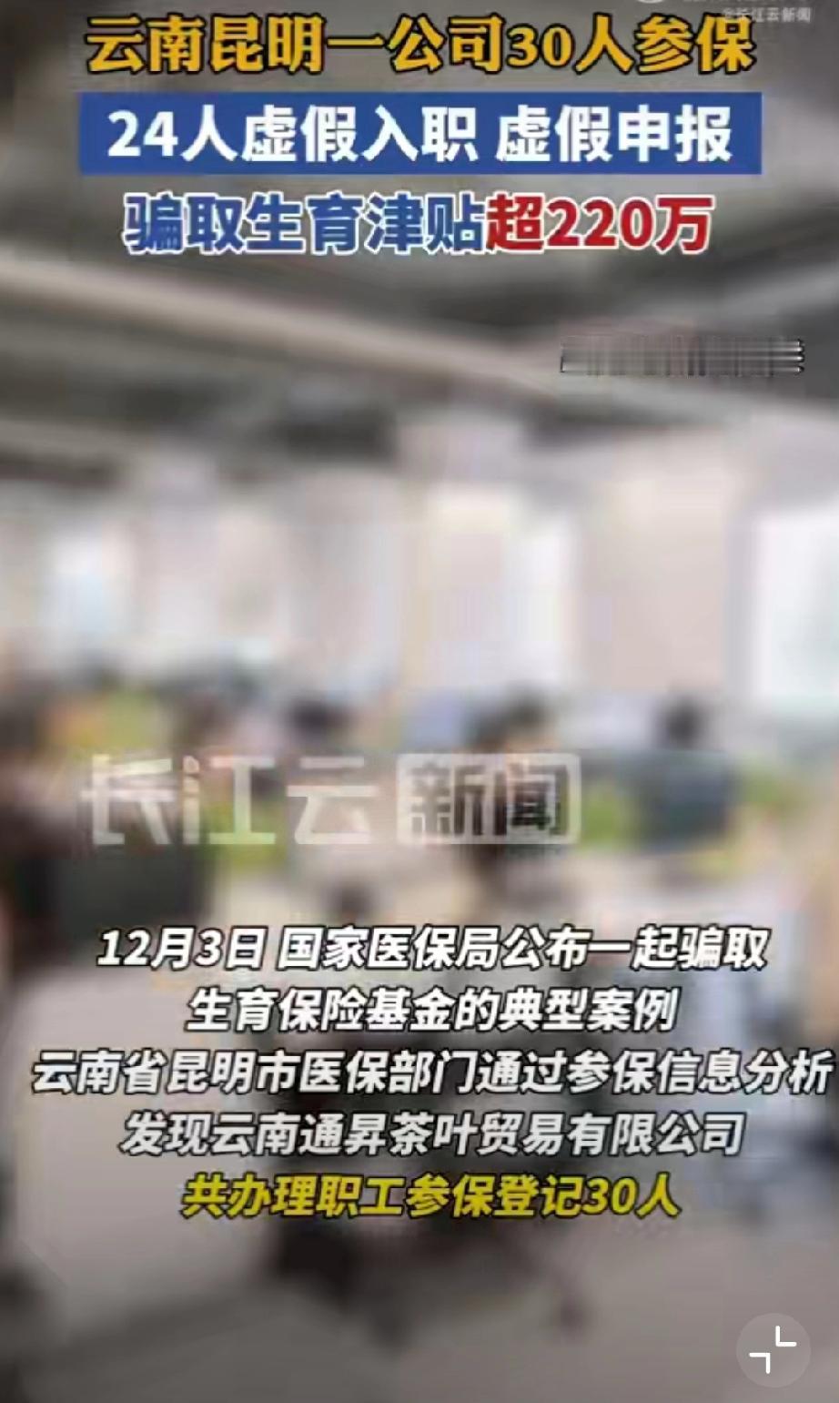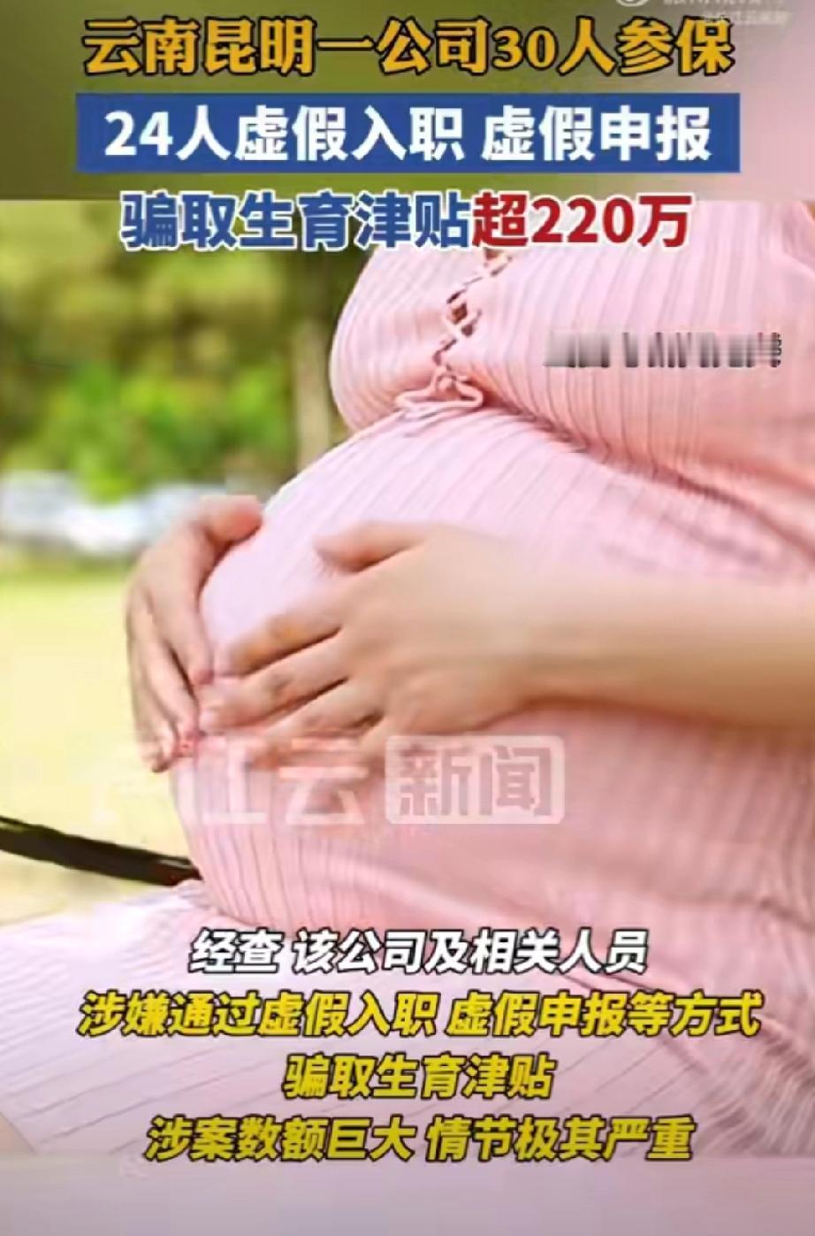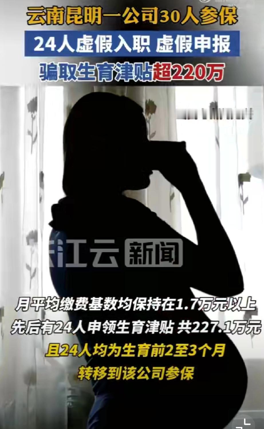 24人骗取生育津贴超220万。该好好打击,甚至一些小公司、瞄上了宝妈这点生育津贴,打着“免费交社保”的名义,骗取生育津贴!这就是造假“骗保” ,没有真实的劳动关系,伪造合同、流水,这是构成诈骗罪的。你以为生育津贴那个公司帮你拿了,你没拿,你就没事了吗,到时候这个公司拍拍屁股直接注销,法人是一个七老八十的农村大妈,查出来是要你本人把生育津贴吐出来的,搞不好还能喜提一副银手镯,送你免费饭吃… 昆明爆料