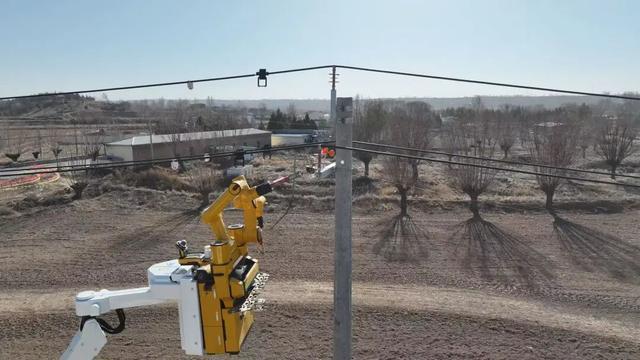 12月1日上午,在靖边县红墩界镇35千伏红墩界变10千伏长胜线作业现场,国网榆林供电公司首次启用带电作业机器人开展接火作业。在绝缘斗臂车的辅助下,一台黄色机器人平稳升空,凭借灵活的机械臂配合高精度传感器,精准完成驱鸟器、故障指示器、接地环及三相引流线等带电搭接任务。整个过程安全、流畅、高效,标志着榆林在电力运维方面取得重大突破,正式迈入智能带电作业时代。