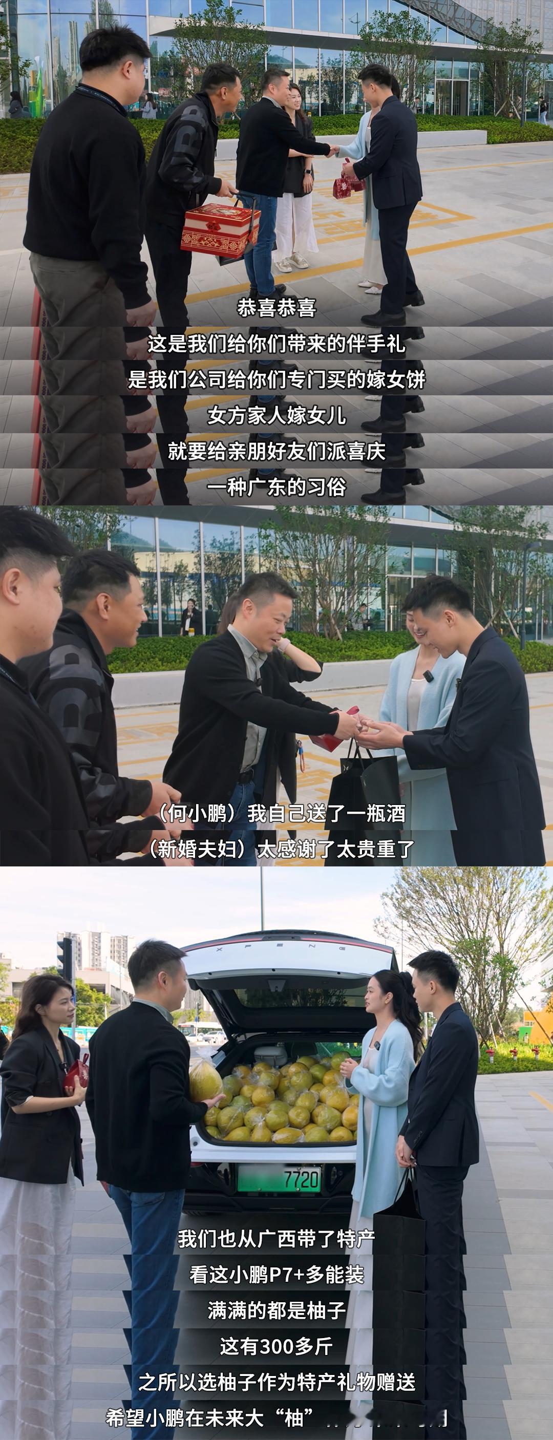 新婚车主奔赴千里给何小鹏送喜糖何小鹏送P7+新婚车主嫁女饼太暖啦!广西95后新人“七七”“十七”婚礼用7台小鹏P7+组婚车队,获何小鹏微博祝福。近日,他们驾驶P7+往返1200km,把喜糖和近400斤广西柚子送到广州小鹏总部。何小鹏收下这份甜蜜,回赠珍藏佳酿和广东“嫁女饼”,这双向奔赴的情谊太戳人~
