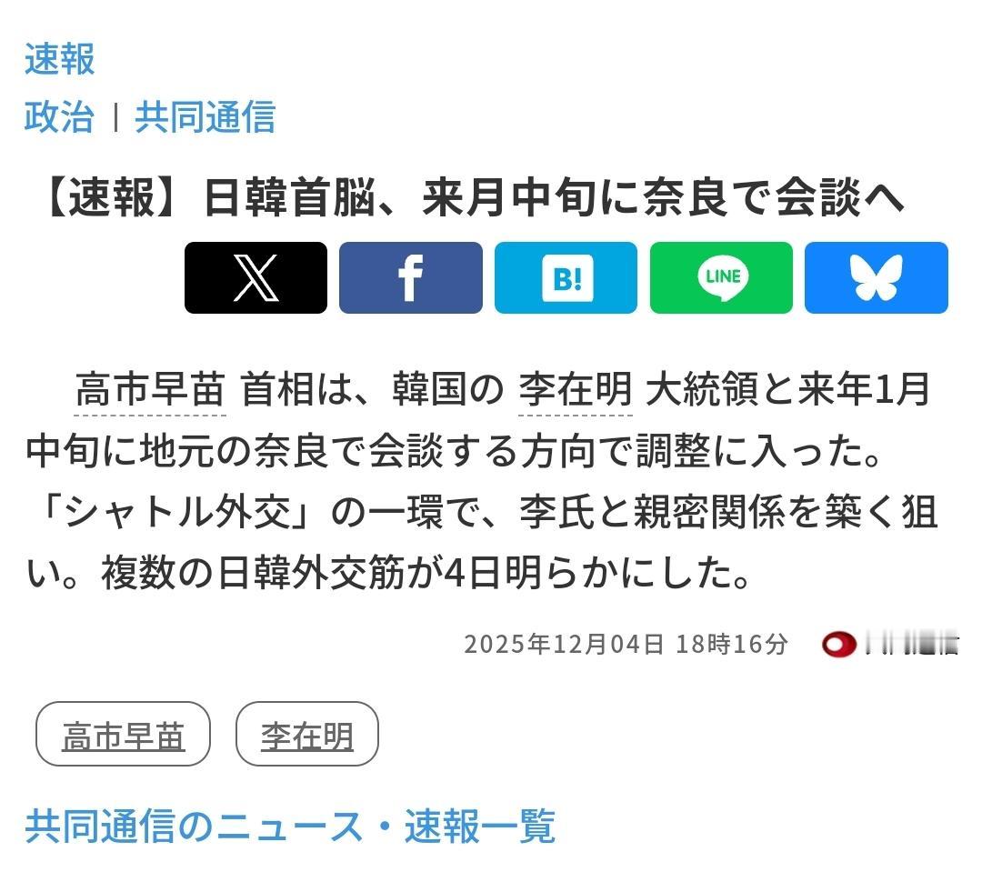 12月4号下午,根据日本和韩国外交消息人士的披露,韩国总统李在明基本确定将于2026年的1月中旬访问高市早苗的老家奈良,并且举行新一轮的日韩首脑会晤。那么如何理解这次会面的内涵呢? 首先,这是日韩所谓“穿梭外交”的又一轮。核心就是通过首脑之间的频繁互访,来推动双边关系的稳定和发展。这轮穿梭外交,从岸田文雄和尹锡悦开始,一直延续至今。目前来看,李在明仍然希望维持与日本的稳定关系;而是由于中日关系恶化,高市早苗的在战略上对韩国的需求变得更强。这也促成了这次奈良会晤的成行。 其次,李在明希望扮演中日之间的斡旋者角色。正如昨天李在明在记者会上所表示的,在当前的尖锐对抗时刻,韩国不应该在中日之间选边站队。因此韩国方面也希望在明年1月访问日本的前后,能够同时访问中国,推动中、日两国关系的缓和与改善。但说实话,韩国的分量可能不够,这个问题也不是韩国能够插手和斡旋的。 第三,日韩首脑这一次在古都奈良的会晤到底能不能够成行?目前看来还存在一定的变数。一方面就是在未来的一个多月当中,高市早苗是否会在殖民侵略的历史问题上,做出一些突破性的表态;另一方面就是,高市是否会如外界所预期的,在12月26号参拜靖国神社。如果她做了这两件事情,那么日韩之间的首脑会晤恐怕也难以进行了。 对李在明来说,他和中方早期的态度是基本一致的。那就是虽然知道高市的极右翼立场,但仍然愿意观望,维持与日本关系的稳定大局。但可惜的是,中国的希望落空了,高市上台之后不久就暴露出了自己的真实心态。那么在对韩关系上,高市早苗的忍让和克制又能够维持多久呢?恐怕明年初或至少上半年,就能看出一个大概的轮廓。