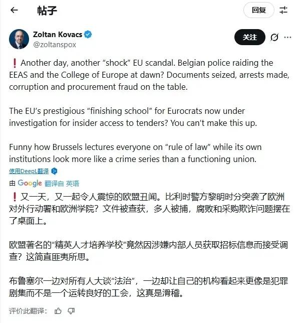 欧盟icon内斗白热化:卡娅·卡拉斯icon杠上冯德莱恩icon 欧盟还没挤进俄乌的谈判桌,内部倒是先爆发了权力斗争。 欧盟这出内斗大戏比俄乌冲突还精彩!冯德莱恩和卡拉斯撕破脸互撕,所谓的“团结欧洲”早就成了笑话! 比利时警方突袭欧盟外交机构,前外长莫盖里尼因涉嫌欺诈被抓,这根本不是偶然,而是两大巨头权力斗争的爆点。冯德莱恩想抢外交权,另设情报部门排挤卡拉斯;卡拉斯直接提名对方死对头当副手,还被以“援乌”为由驳回预算申请。 一边对全世界喊着“法治”,自家机构却成了贪腐窝点,匈牙利发言人那句吐槽太戳心!欧盟连内部烂摊子都收拾不了,还整天端着“教师爷”架子指责别人,这套双标操作简直刷新下限。 真正的强大从来不是对外摆谱,而是先把自家门户理清。你觉得这场内斗会让欧盟的国际影响力下滑吗?评论区聊聊~