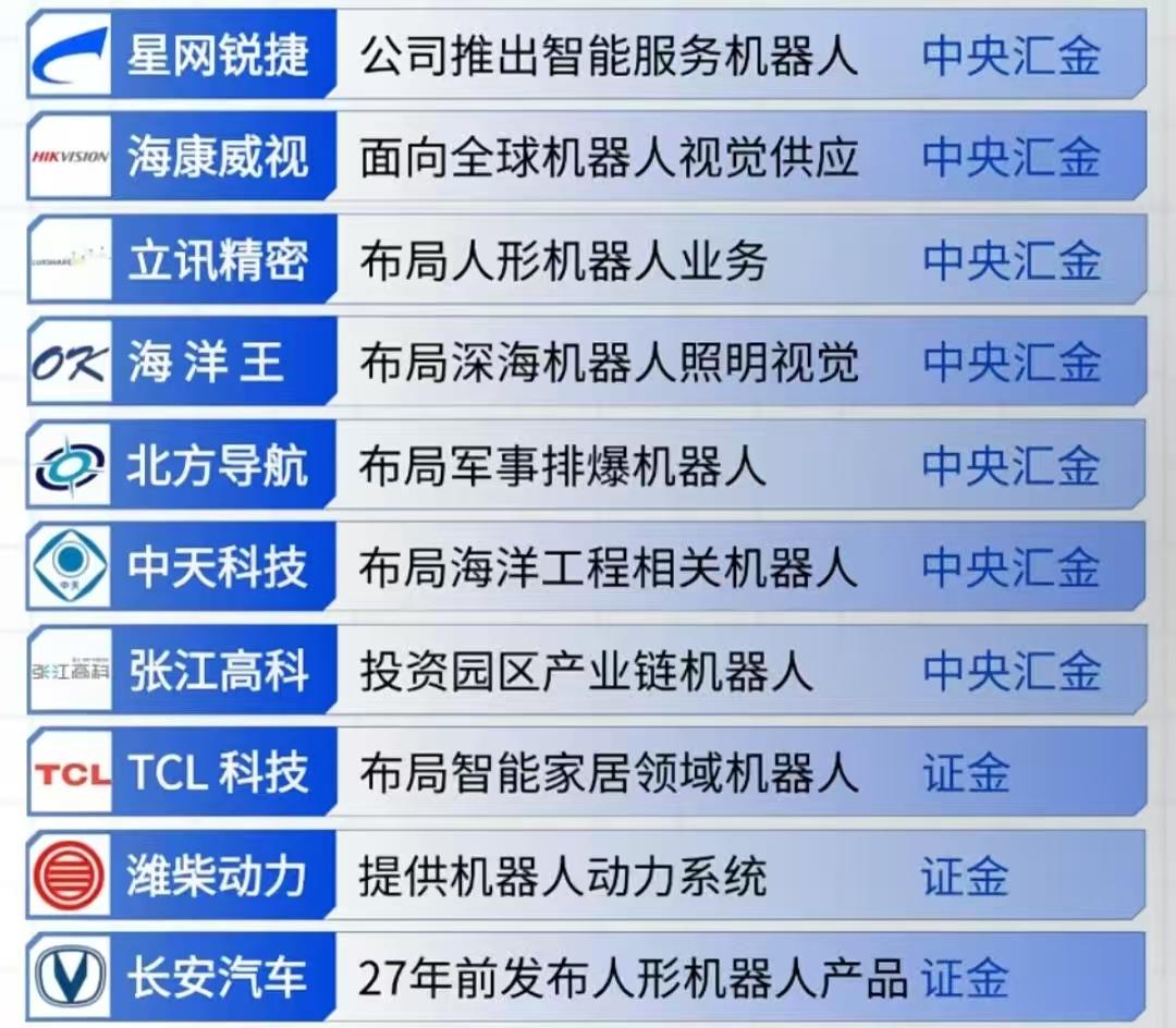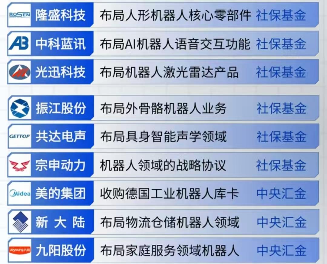 国家队布局机器人概念公司梳理! 2025年12月4日,美政府在推动AI发展后转向聚焦机器人,美股机器人概念股走强,iRobot收涨74.36%!A股国家队重仓的机器人概念龙头有哪些? 机器人赛道的国家队社保、汇金、大基金齐进场。从三花智控的机器人零部件,到美的集团收购库卡,从海康威视的机器人视觉,到北方华创的AI芯片…… 人形机器人赛道又迎重磅催化!从总成、灵巧手到传感器、减速器,这条产业链的核心标的都给你理清楚了放在下面图片里,相关环节的机会值得重点关注~ 理财有风险入市需谨慎,资料取材网络仅供参考。机器人股