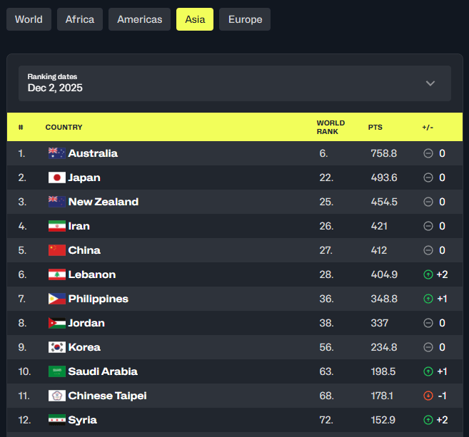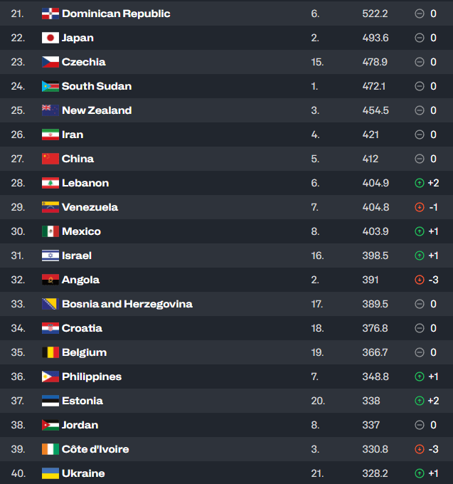 在亚洲区,黎巴嫩男篮上升2名升至第28位,中国男篮排名不变位列第27位。