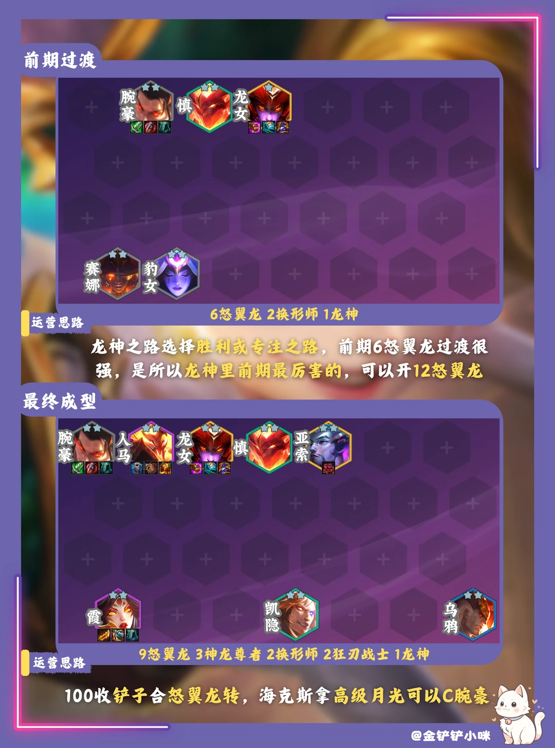 🔴龙女强度T0.5,是龙神里前期最强的,过渡很舒服 🔴龙女福气临门效果:龙女着陆时每命中一个目标有35%概率获得1金币 🔴追大羁绊100层找铲&锅,追三星五费100层找大妮蔻,龙神多125层找专属龙神强化