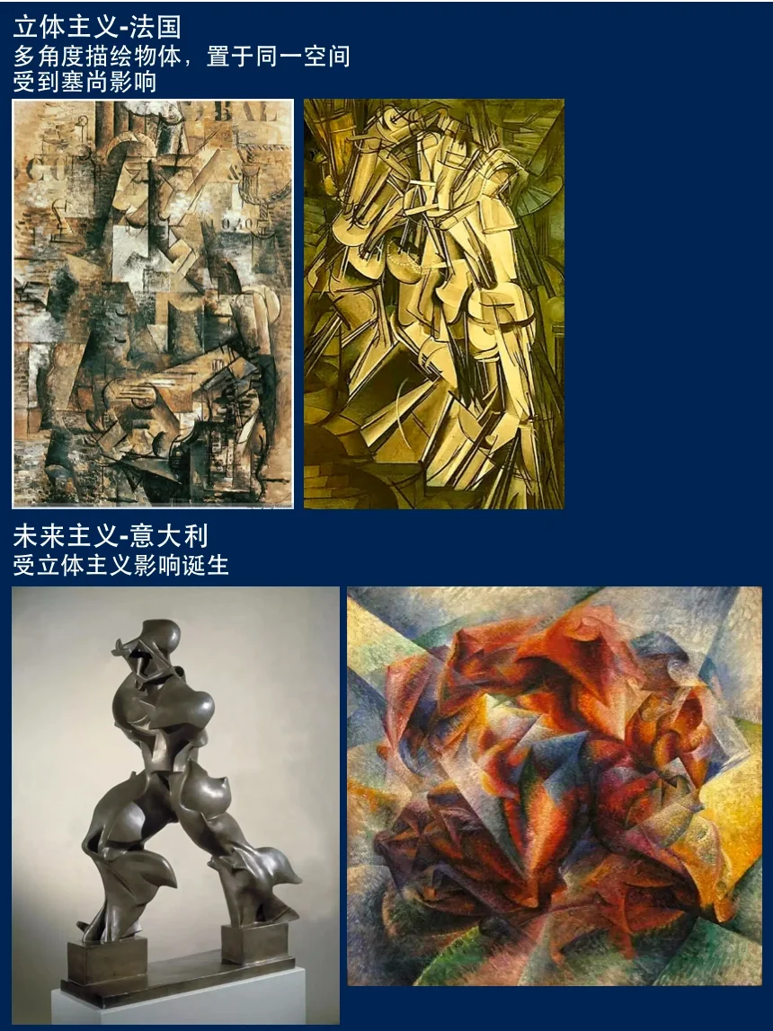 马蒂斯因此创造了野兽派,而毕加索,则向着立体主义进发,形成将不同视角组合为同一画面的独特风格,并影响了意大利未来主义的诞生。