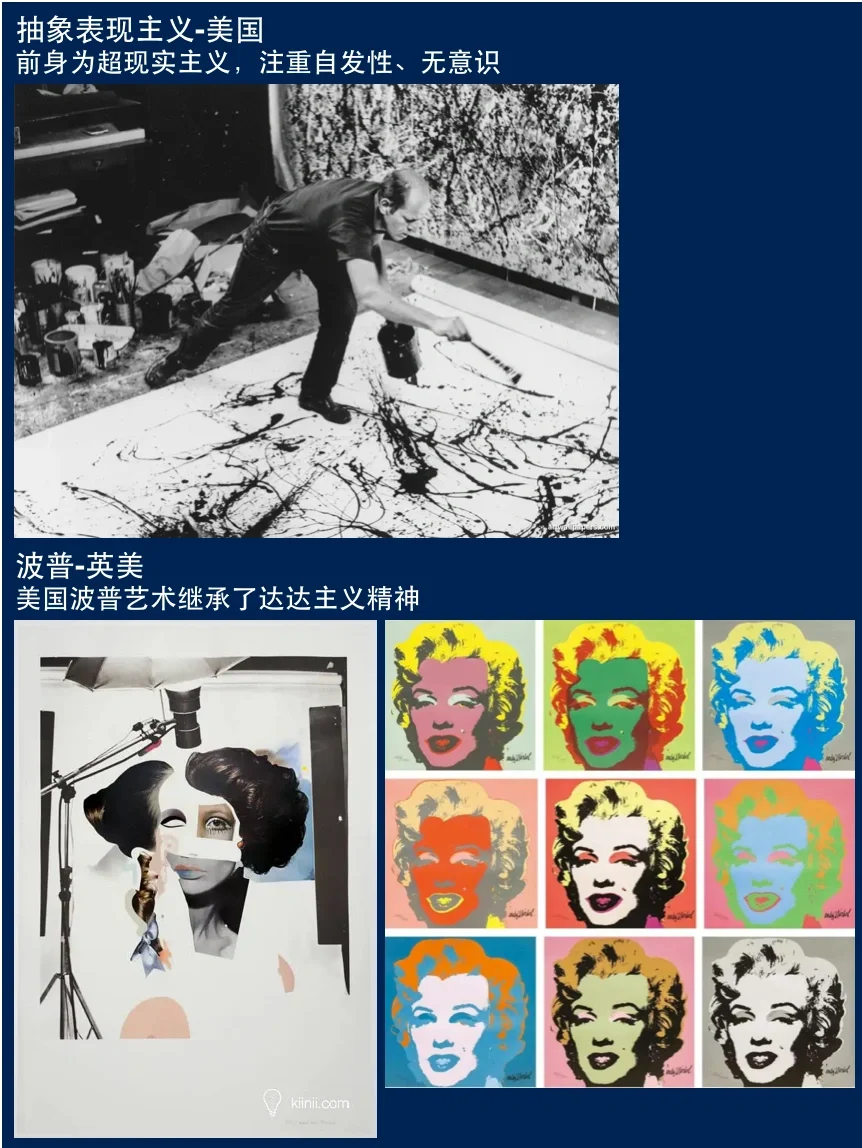 40年代开始,受二战影响,艺术市场逐渐向纽约转移,结合抽象形式和表现主义情感的抽象表现主义、抨击消费主义社会的波普丝网印刷品,风行世界。