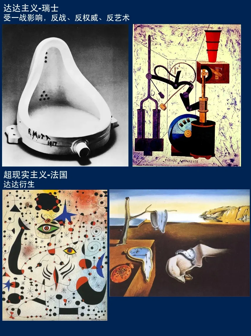 20世纪20年代,一战的席卷终止了这一局面,一些艺术家对战争感到绝望,他们反对社会、文化、传统和秩序,提出了达达主义。