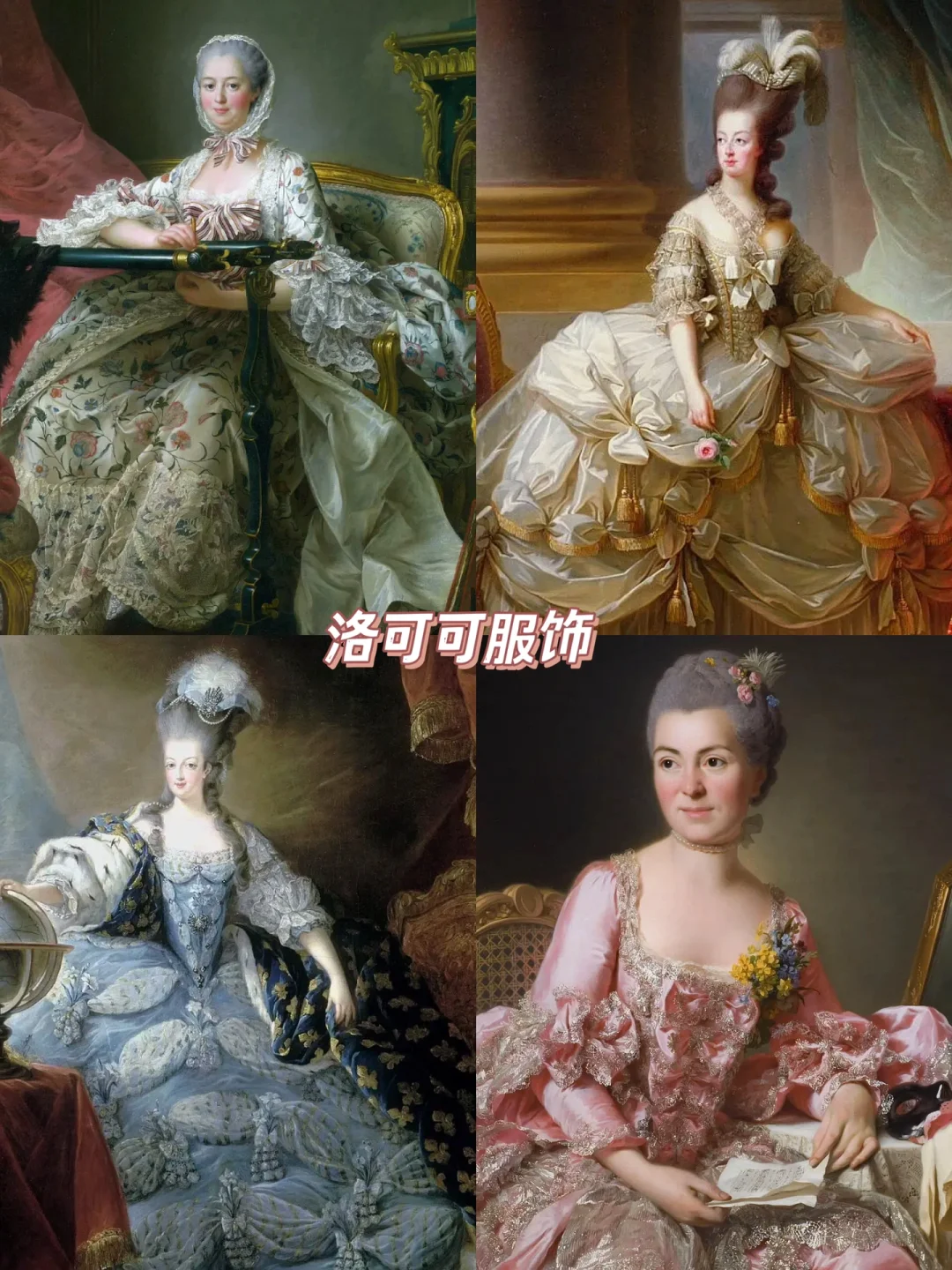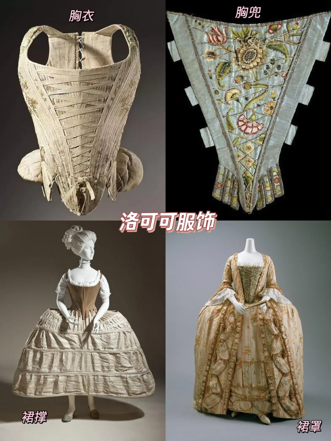 洛可可服饰由紧身胸衣、胸兜、帕尼埃裙撑(前后扁平、两侧宽大)、衬裙以及罗布(裙罩)组成。