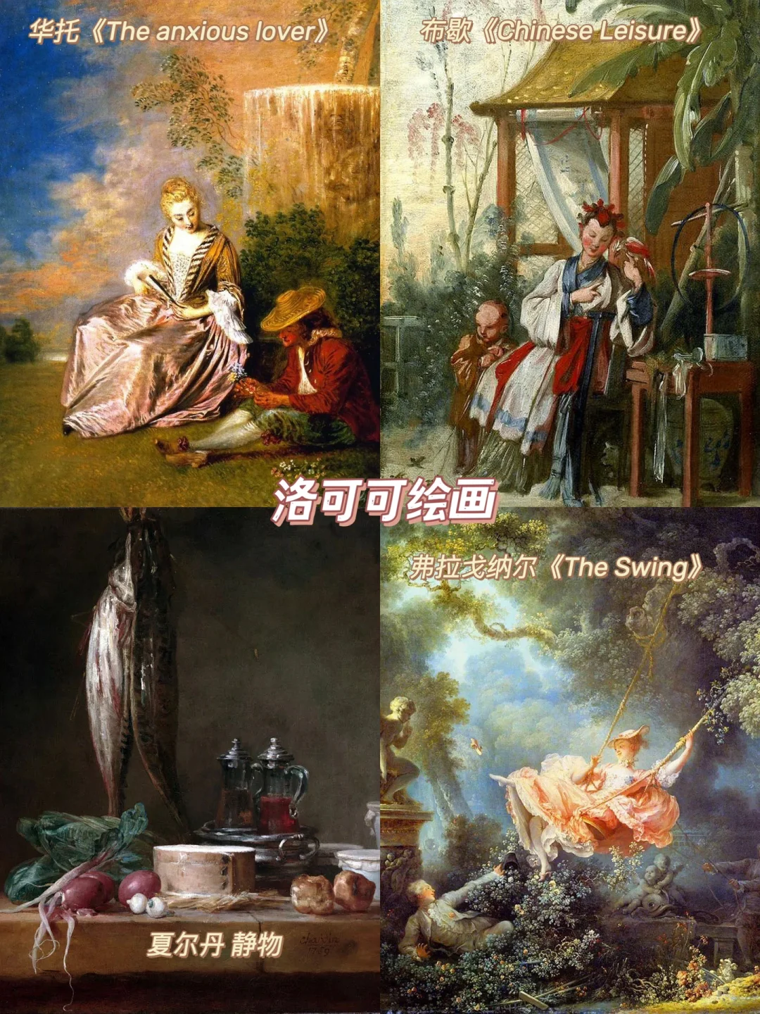 得益于蓬巴杜夫人赞助,洛可可绘画迅速发展,它通常以贵族生活、浪漫爱情为主题,呈现出色彩柔和、线条模糊、人物纤细、画面唯美的特点。