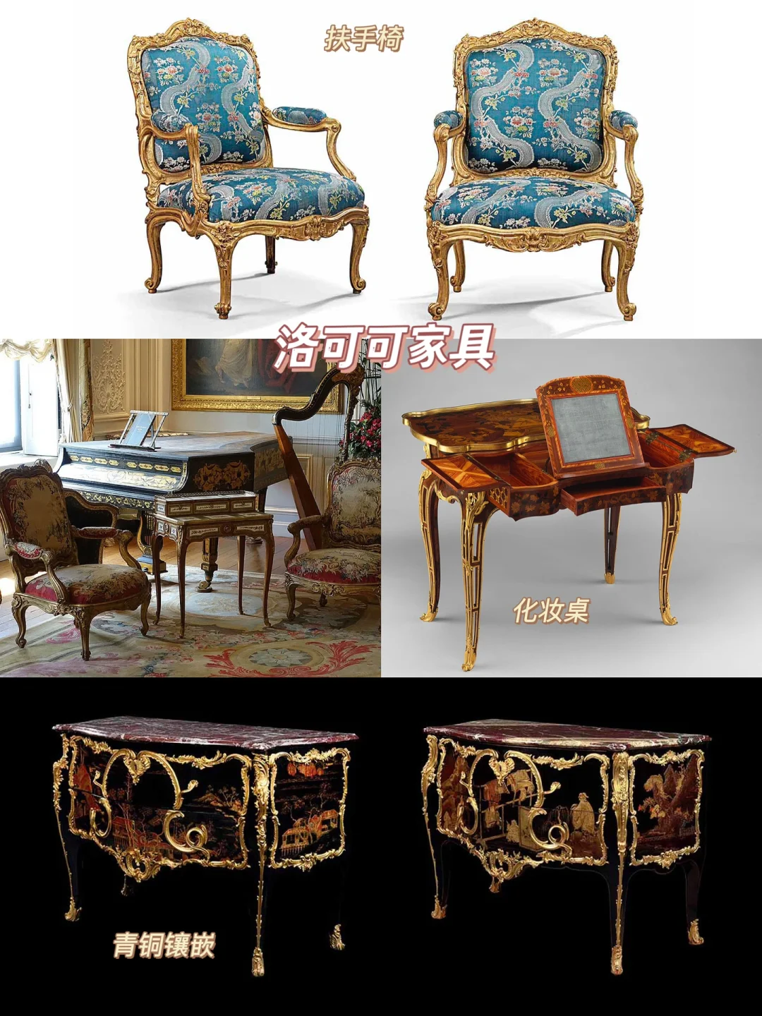 家具方面,早在奥尔良公爵摄政期间,便引领起造型圆润、曲线流畅、雕饰灵巧,小而美的家具风潮。到了路易十五时期,座椅流行天鹅绒包衬、S腿型,桌子表面采取薄木拼贴、珠宝镶嵌、青铜装饰,并出现了仿中国漆绘。