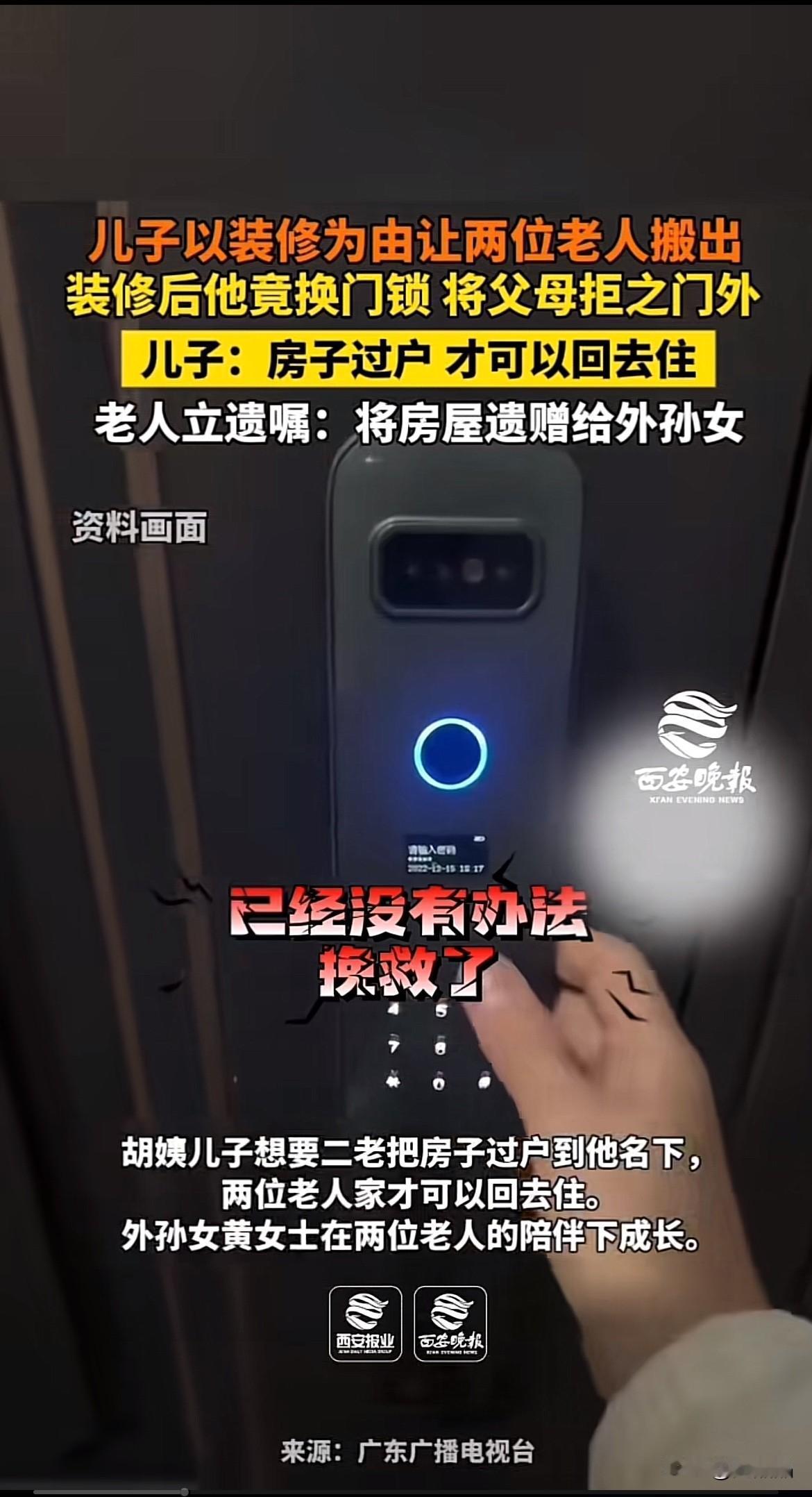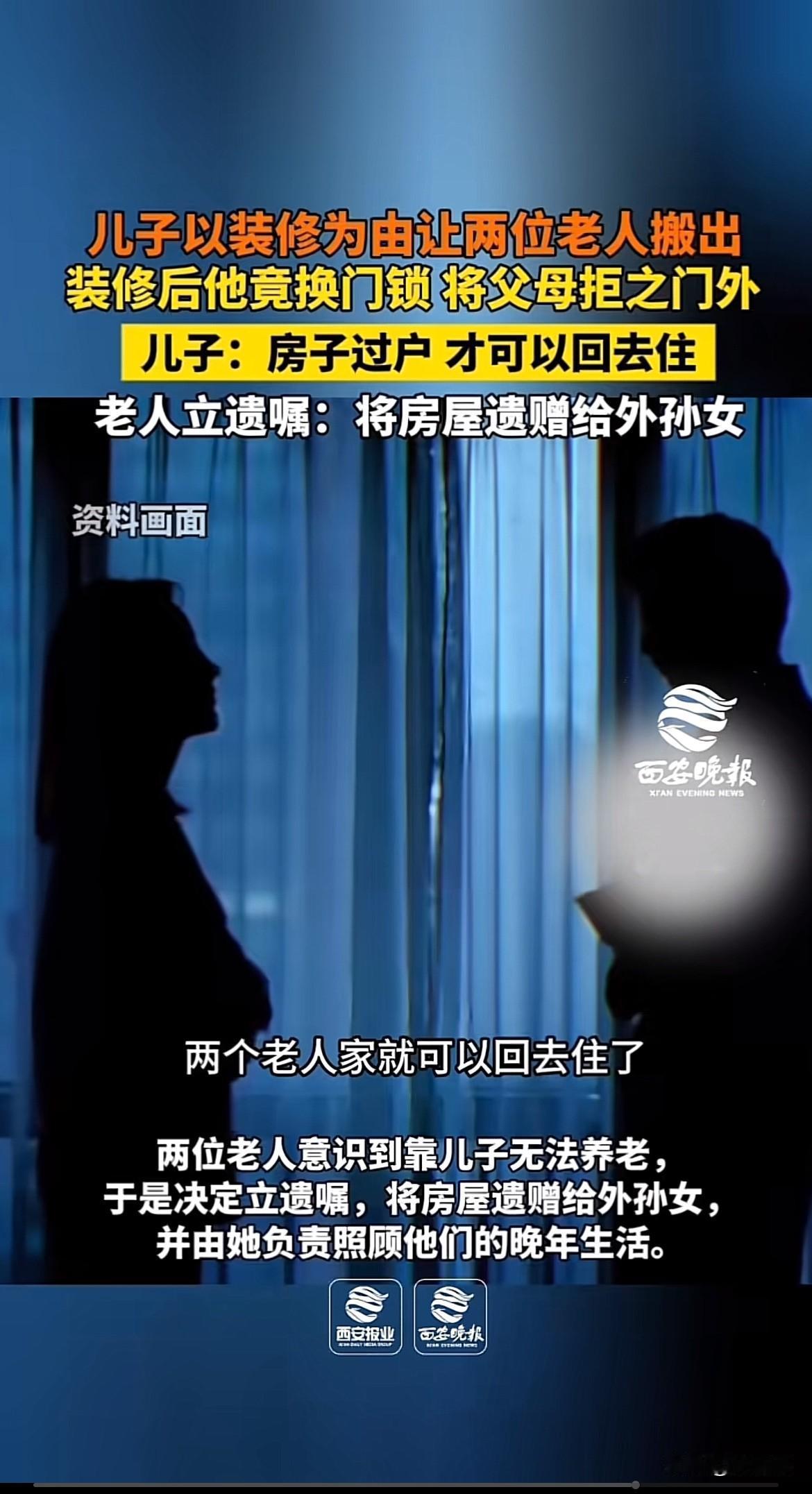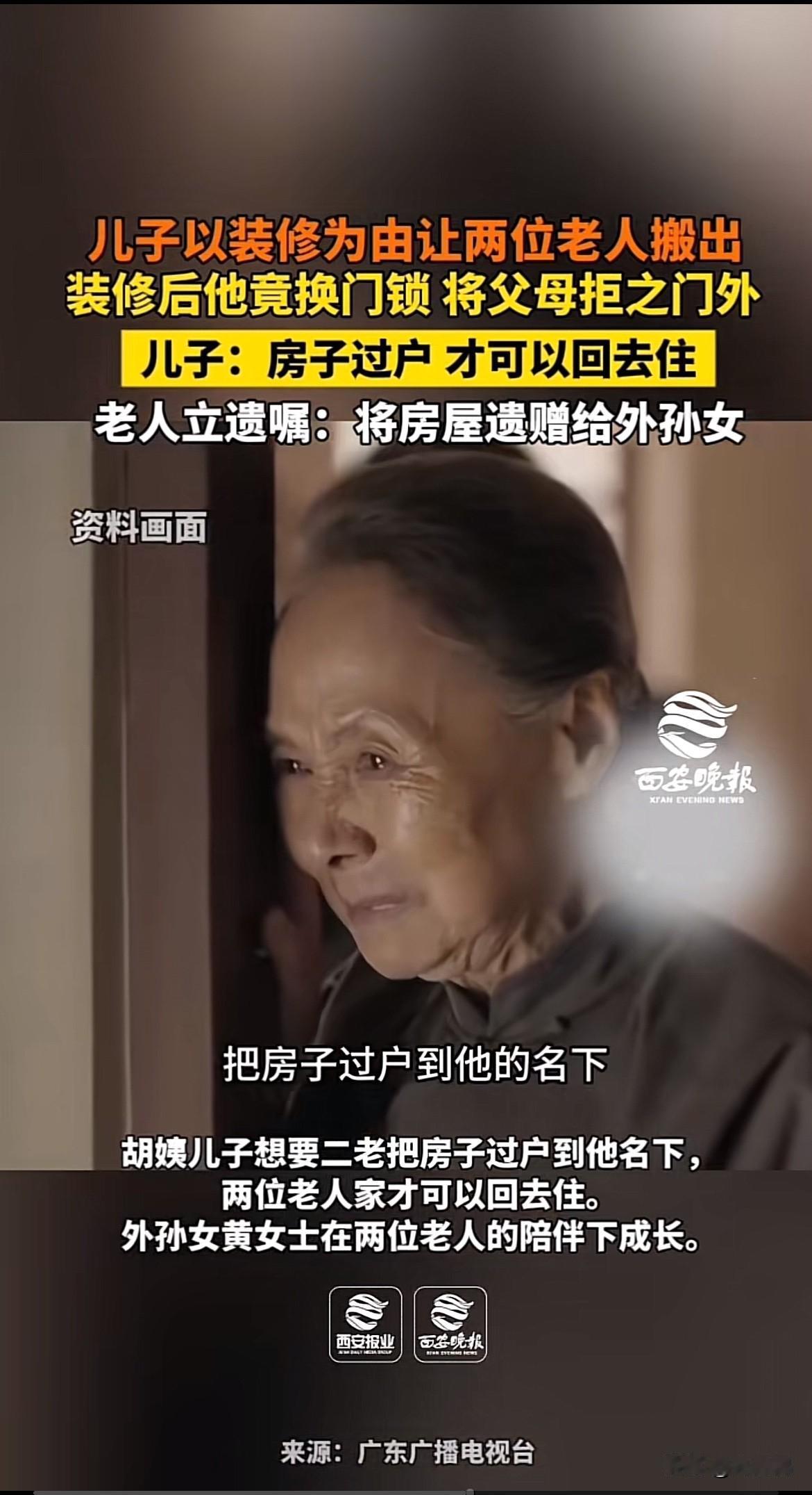偷鸡不成蚀把米!亲儿子新婚后以装修新房为由,骗八旬父母搬走,换锁不让父母回去住,用房产过户威逼,没想到父母立遗嘱,人房两空! 广东,胡姨夫妇一直和儿子居住,虽说儿子年纪大了,没买房独住,但自己夫妇俩也七老八十了,晚年生活还得依靠儿子养老和照顾,也就没让儿子搬出去住。 最近儿子新婚,看着儿子成家立业,胡姨夫妇别提多高兴,了了他们多年的心事。婚后儿子提出装修新房,让父母暂时搬出去住。胡姨想着他们百年以后,房子也是给儿子的,老两口也就同意了。 几个月过去了,迟迟不见儿子来接老两口回家,于是胡姨回家想看看装修好了没,拿出钥匙开门,发现门锁换了,打电话过去给儿子一问:“儿子,家里的锁怎么换了?我和你爸进不去。” 儿子那头传来冰冷的声音,“妈,我把锁换了,你们把房子过户给我,你们就可以回来住。” 老两口恍然大悟,装修是假,赶他们走是真!自己一直待儿子不薄,没想到临老了,被儿子赶出家门,侵占房产。 老两口心想:“老了不中用了,被儿子嫌弃了。虽说过户房子就让我们搬回去住,谁知道过户完会不会反悔呢?儿子靠不住啊!” 老两口决定立遗嘱,把房产过户给外孙女,由外孙女照顾他们的晚年生活。外孙女和他们感情深厚,又孝顺,比儿子靠谱得多。 胡姨儿子聪明反被聪明误,明明自己照顾父母终老,房产自然而然就是他的了。竟然狠心到赶自己年迈的父母出家门,霸占房产,不想照顾,又想要房啃老,哪有那么好的事?没良心!没道德!真的活该!