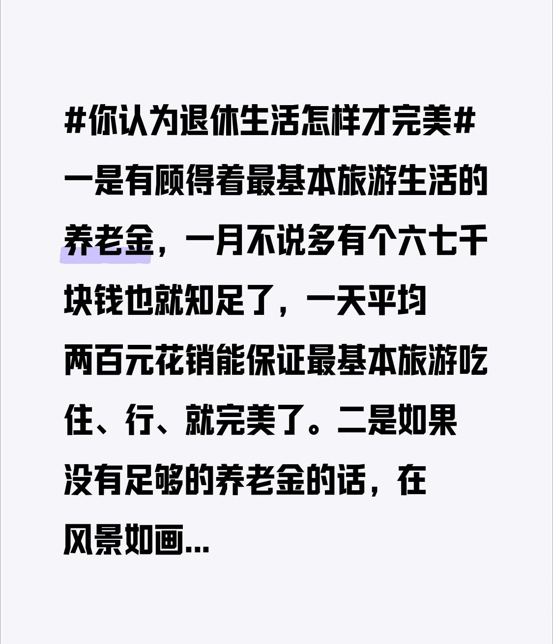 一是有顾得着最基本旅游生活的养老金,一月不说多有个六七千块钱也就知足了,一天平均两百元花销能保证最基本旅游吃住、行、就完美了。 二是如果没有足够的养老金的话,在风景如画的僻静处有一处陋室养老也可,最好是离一般的大医院也不要太远的地方,预防不测,以免得到及时诊治。 三是如果想再清静谈泊世俗的话,出家当和尚也不失为一种人生活法的一种理想状态。