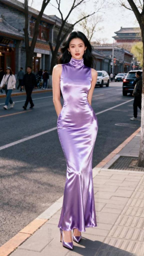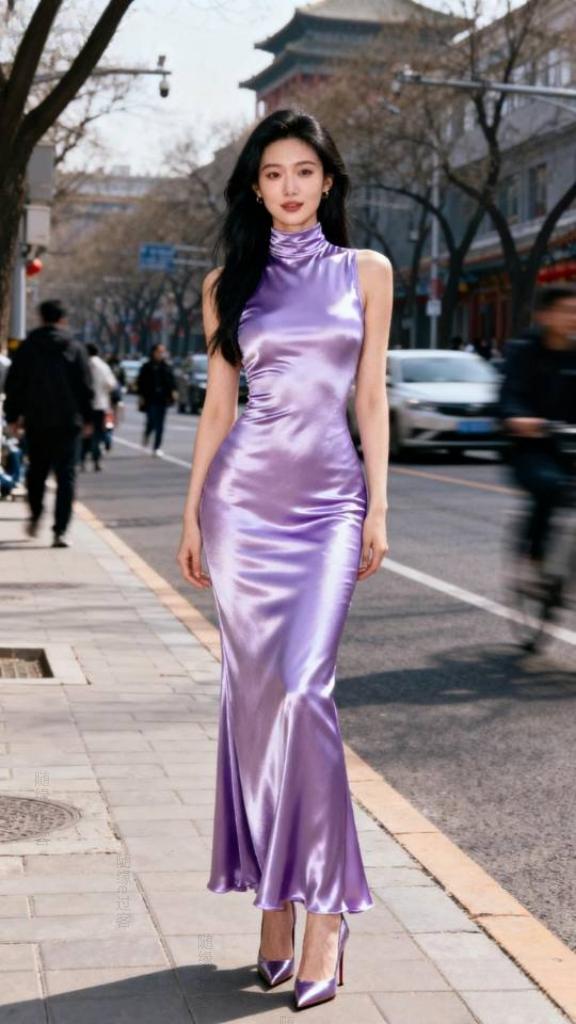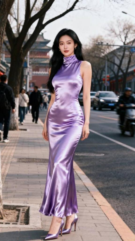 紫色连衣长裙女子写真。连衣裙 美女壁纸
